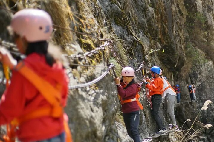 如果担心专业攀岩门槛太高,别急,石门关为你准备了体验版的岩壁探险——飞拉达。即使毫无经验,也可以在专业设备的保护下,化身“蜘蛛侠”,沿着绝壁上的铁缆横跨、上升,将万丈深渊踩在脚下,收获同样的惊险与刺激,安全感却满分。