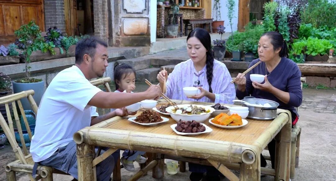 周边的朋友和粉丝看了我们的视频之后,都说很想尝一尝我们家做的饭菜。所以她们就会来到我们小院参观,在这里吃顿饭,大家聊聊天、喝杯茶,挺惬意的。