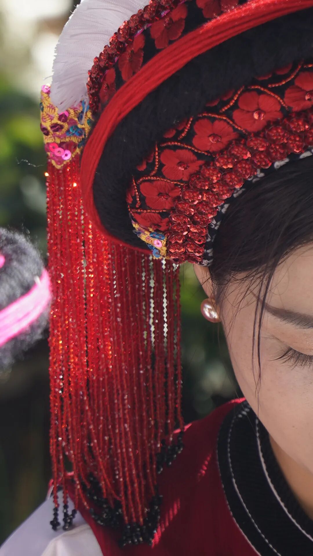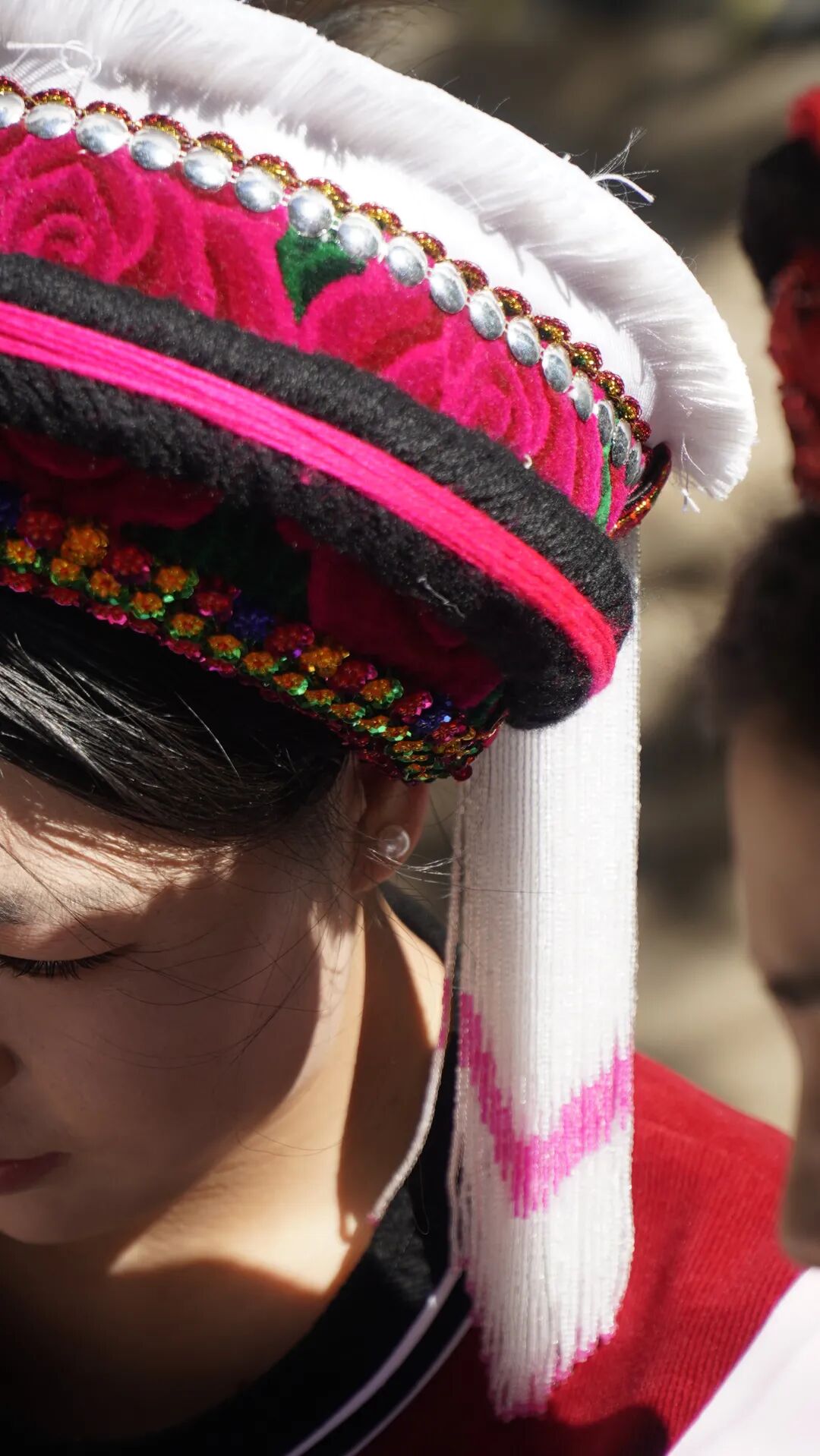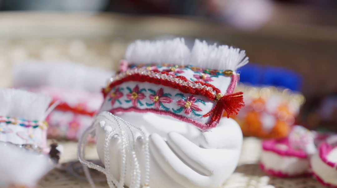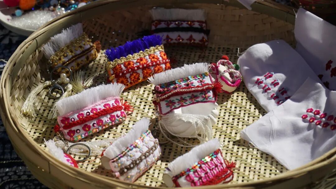 王丽美:“这些白族小包头都是我和妹妹一针一线制作的,一个小包头需要两三个小时才能完成。因为是纯手工制作,所以没有一模一样的作品,每个作品都是独一无二的,此外我们还在包头里加了艾草叶,起到安神的作用。”