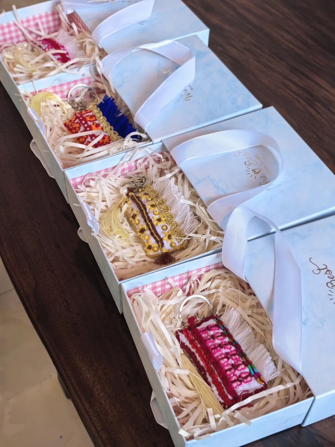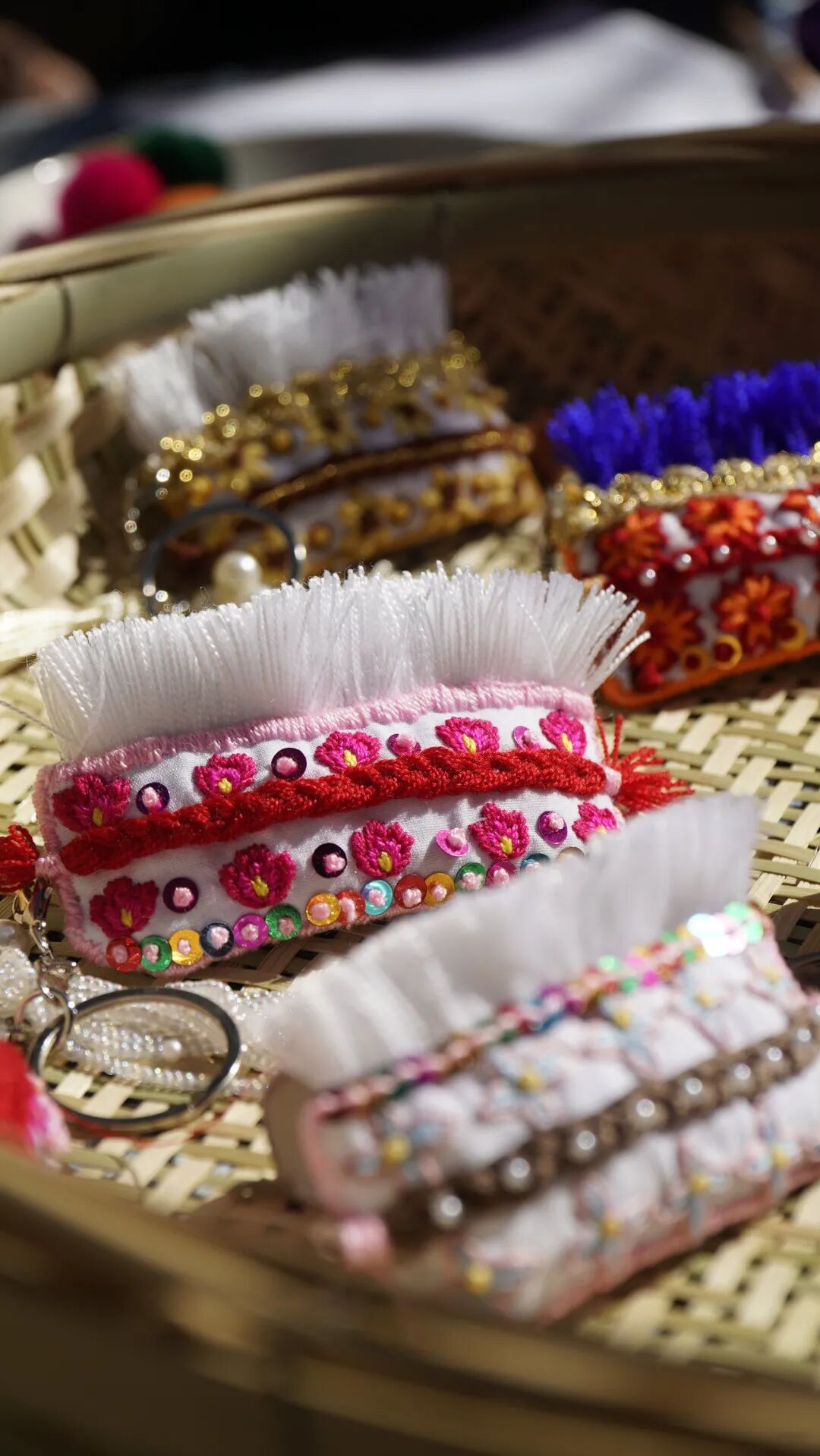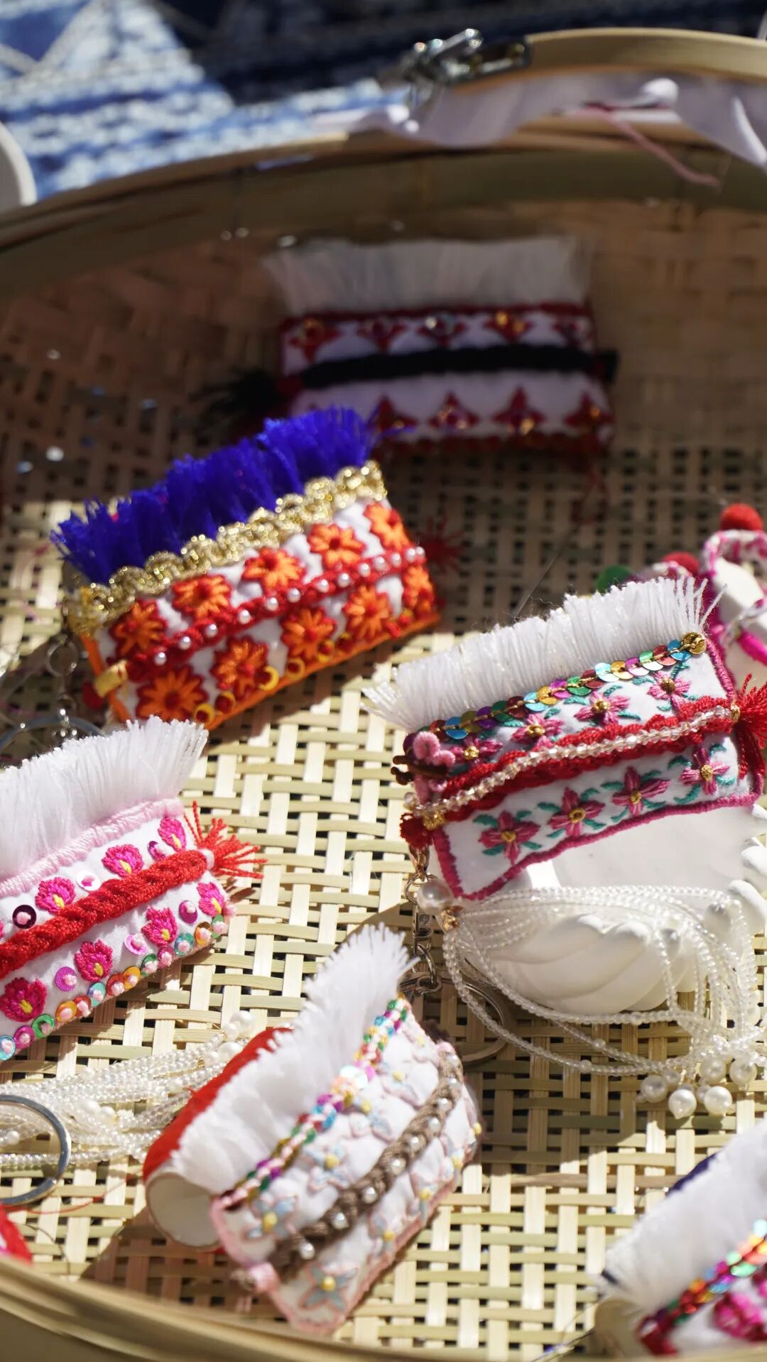 随着挖色镇游客日益增多,不少人对象征着大理 “风花雪月” 的白族包头兴趣浓厚,但传统手工刺绣包头价格偏高,且购买后大多容易闲置。于是妹妹刘燕萍想到何不把白族包头“缩小”做成钥匙扣,这样既可以发挥她刺绣的特长,又能让游客和网友买到独具大理特色的文创产品。在这一想法的促使下,“掌心系列”大理文创产品应运而生。为什么是“掌心系列”?姐妹俩说:“只有放在掌心里的东西,才是最宝贝的。”她们把大理的白族文化视为珍宝,也希望收到产品的顾客能够喜欢、爱惜。
