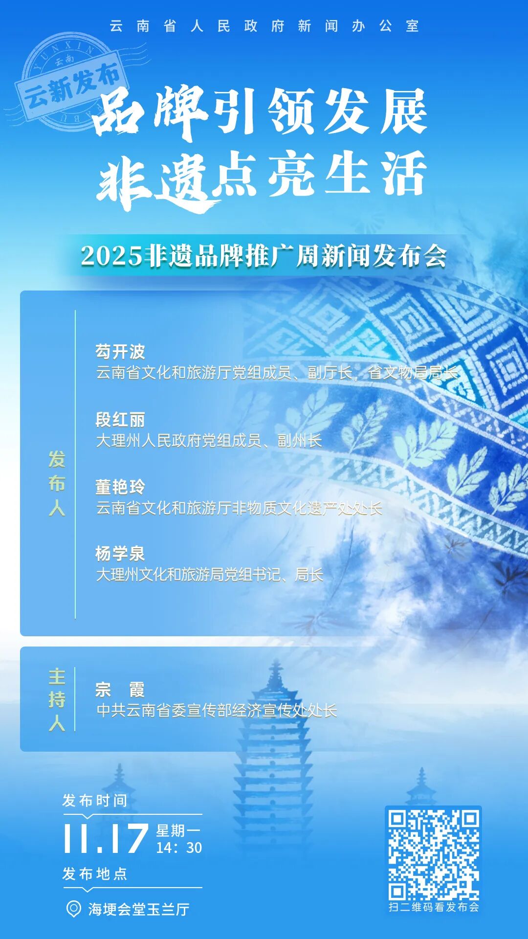 11月17日下午,云南省人民政府新闻办公室在云南海埂会堂,举行“品牌引领发展,非遗点亮生活”2025非遗品牌推广周新闻发布会,介绍相关情况并回答记者提问。