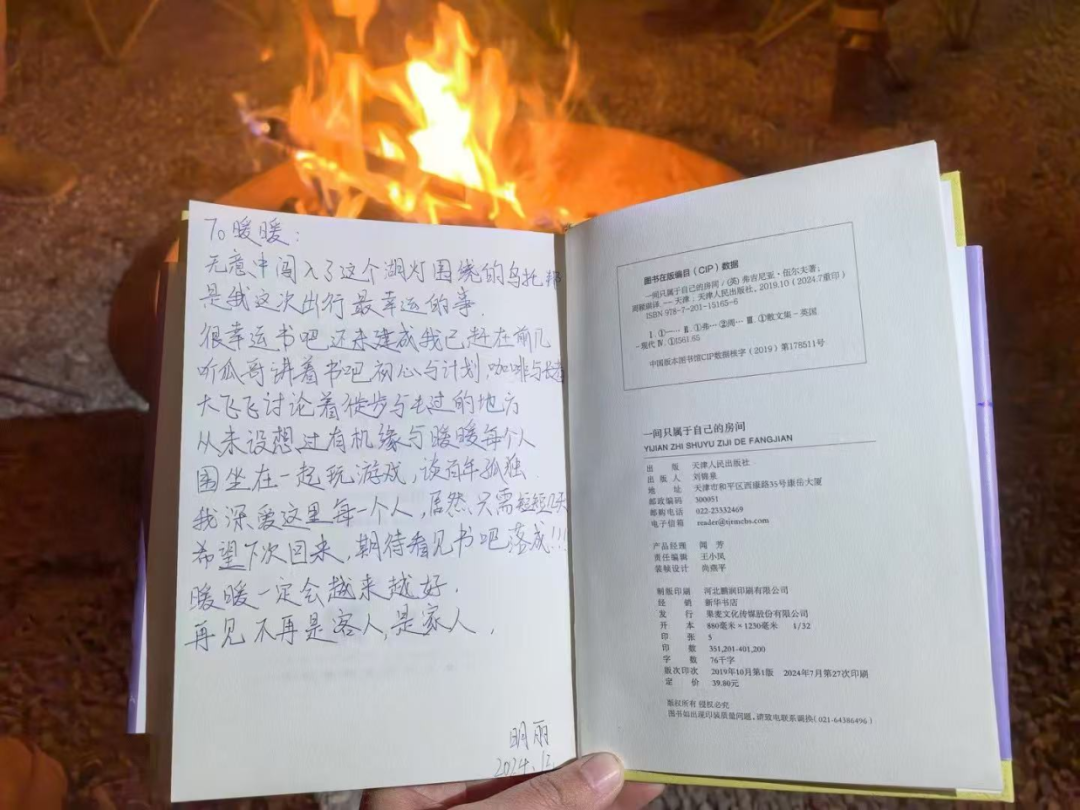 除了当地人的包容和开放让郭剑飞动容,暖暖青年社区本身也在持续温暖着远道而来的人们。她回忆起2024年到社区的一位小姑娘:“离开时,她为了期待社区书屋的建成,留下了一本自己正在看的书,并在书的封面写满了话。她说暖暖就是她在大理的家。我当时看了之后眼泪刷的就流下来了。你并没有为她做很多,只是跟她聊天、生活了两天,但她却感受到了一种特别强烈的被接纳、被尊重和被温暖。”