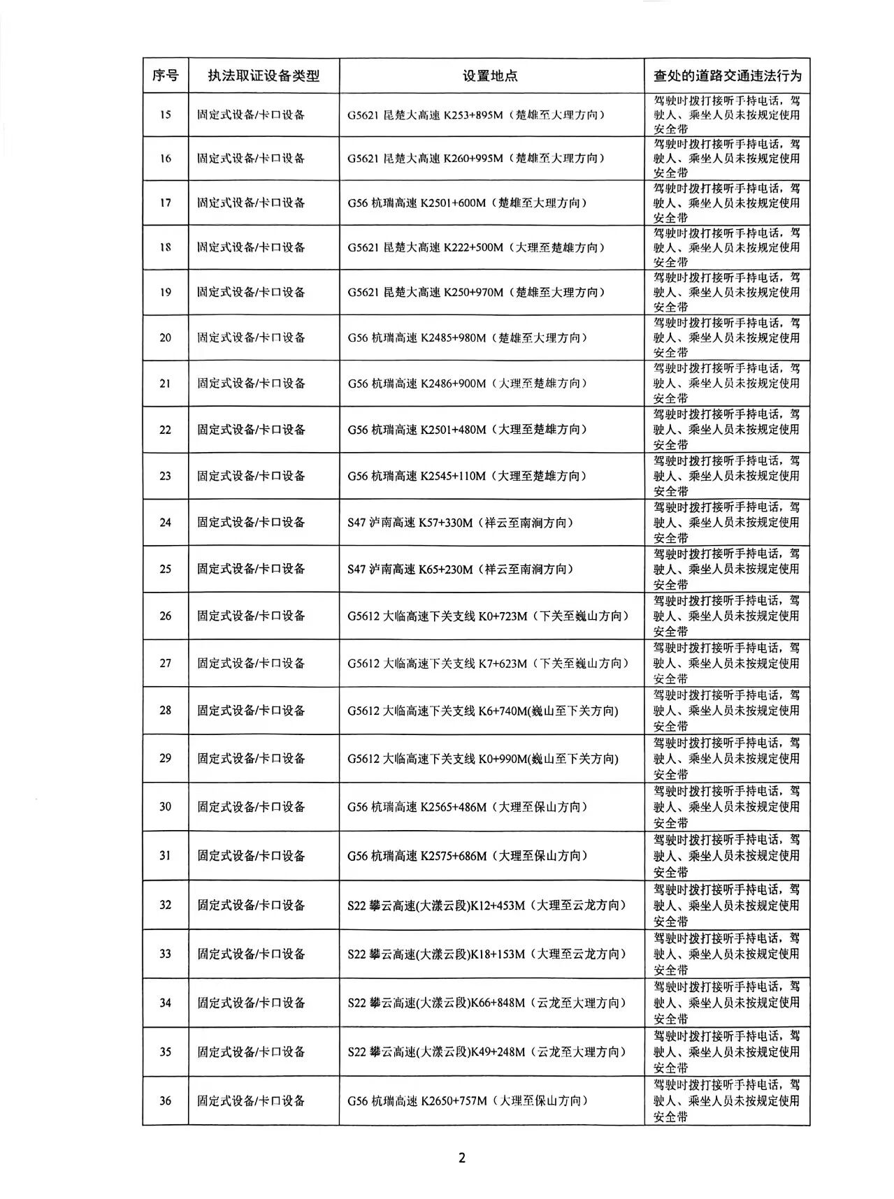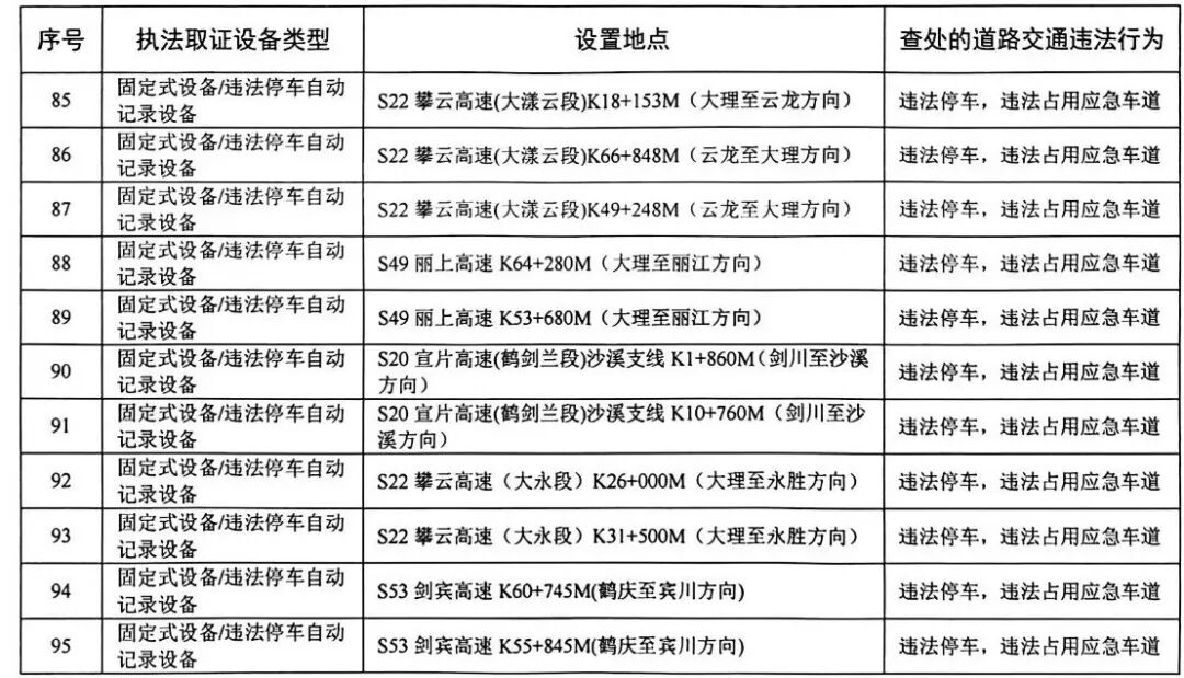 为维护道路交通管理秩序,有效遏制交通违法行为,预防和减少道路交通事故的发生,营造良好道路通行环境,大理州公安局交通管理支队决定自2025年12月5日起,在大理州辖区高速公路启用以下95套交通技术监控设备,依据《中华人民共和国行政处罚法》《中华人民共和国道路交通安全法》《云南省道路交通安全条例》等法律法规规定,现向社会公示监控设备设置地点及查处的道路交通违法行为,请广大群众自觉遵守交通法规,共同维护道路交通秩序。