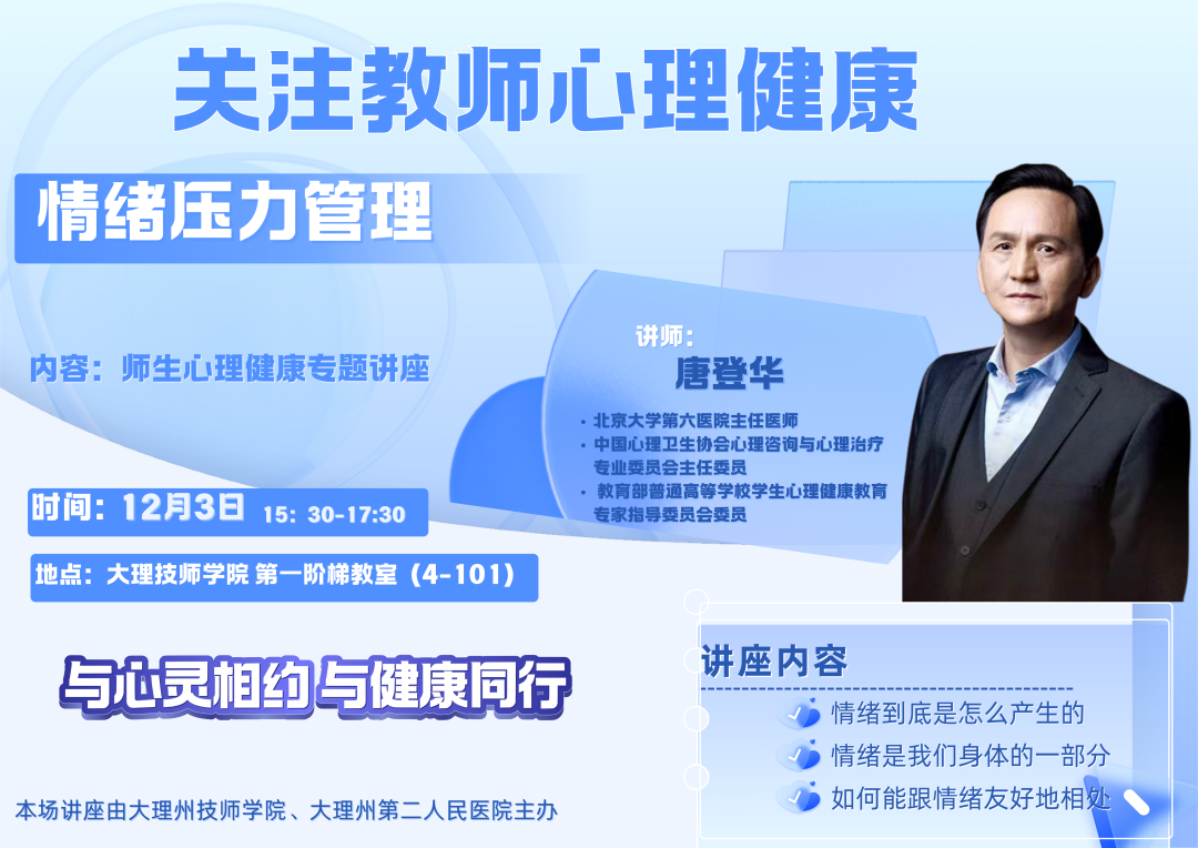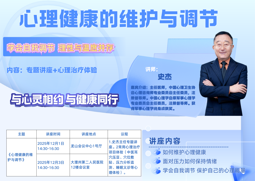 邀请了中国心理卫生协会专家,将在大理开展3场心理学讲座,通过“进机关,进学校,进企业”的方式,深入到各级机关、各类学校以及企业,广泛覆盖不同职业和年龄段的人群,让心灵得到彻底的放松和成长。