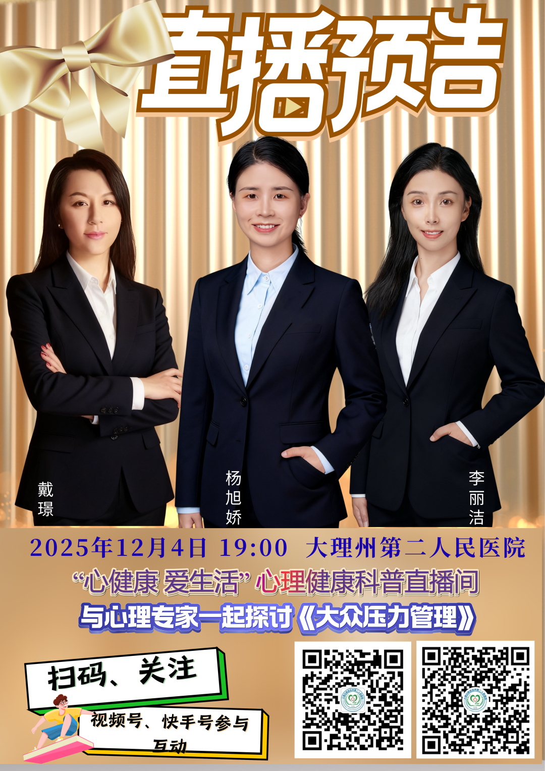 活动将邀请心理专家戴璟、大理州二院杨旭娇、李丽洁医师共同走进大理州第二人民医院“心健康 爱生活”心理健康科普公益直播间,通过视频号、快手号等多种媒体渠道开展1场线上心理健康知识科普活动,让我们与自己的心灵温柔相遇,这里没有评判,只有理解,没有说教,只有陪伴。