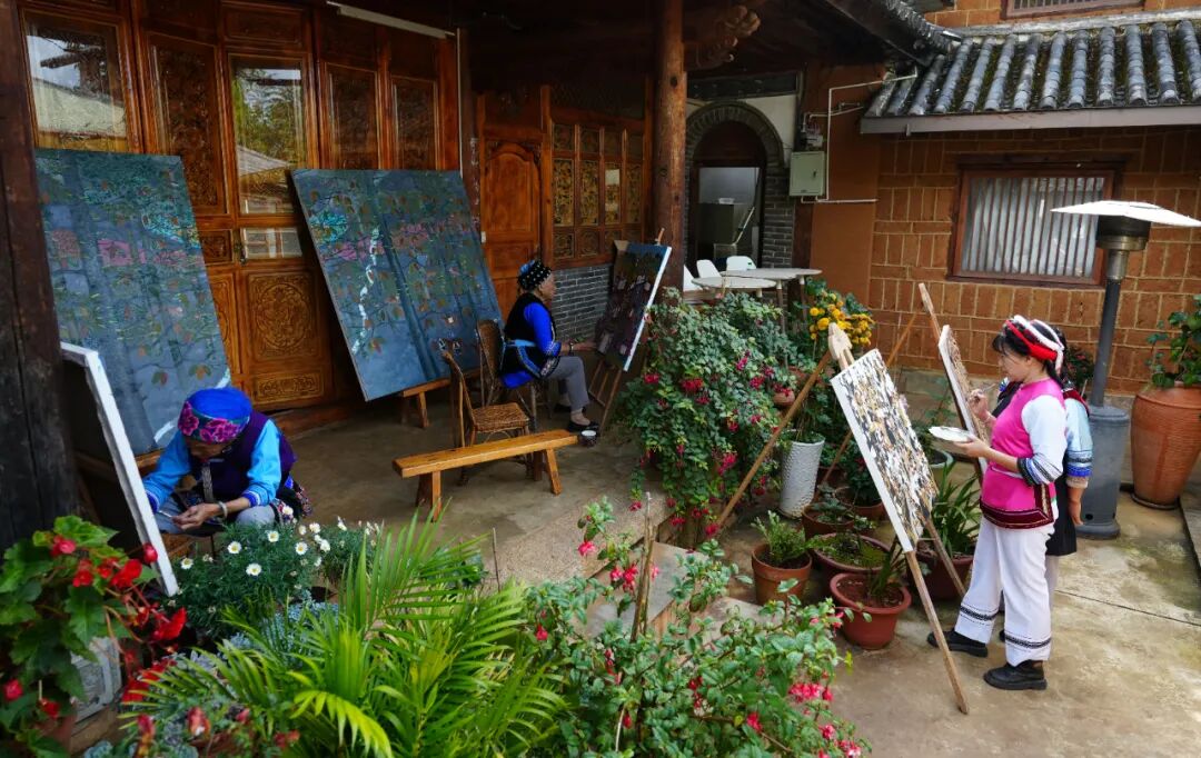 “乡土就是最好的素材库。”李艳丽说。十余年来,她们结伴写生,鸡足山的云雾、宾川的葡萄串、巍宝山赶街的热闹,都成了画布上的风景。但更多时候,她们提笔就能作画,一辈子的乡土记忆,足以提供源源不断的创作灵感——