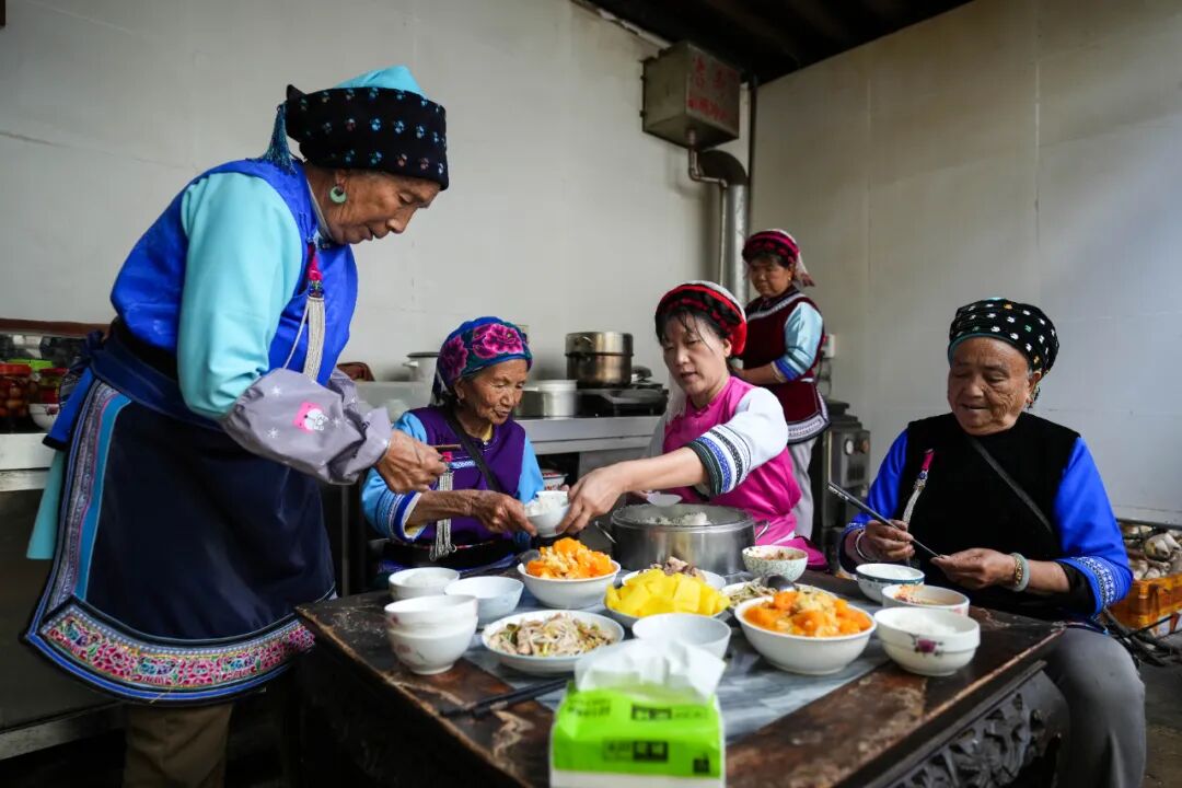 中午时分,伙山村的奶奶们在“农民画社”吃饭,她们一起创作油画、一起吃饭。