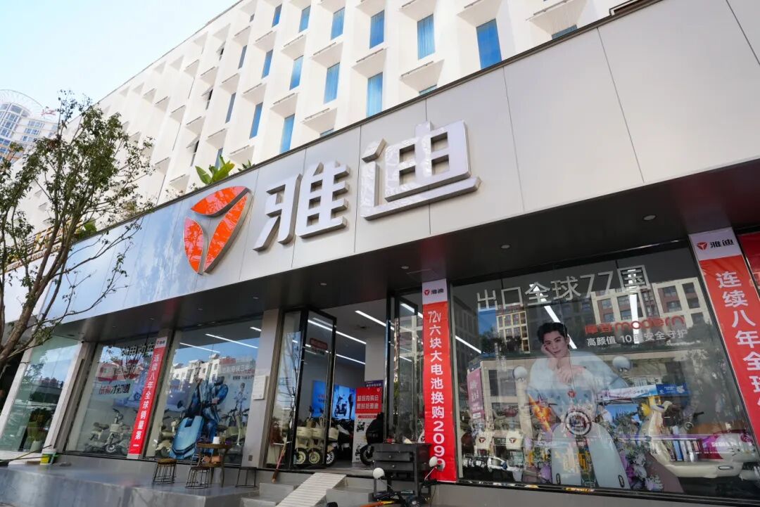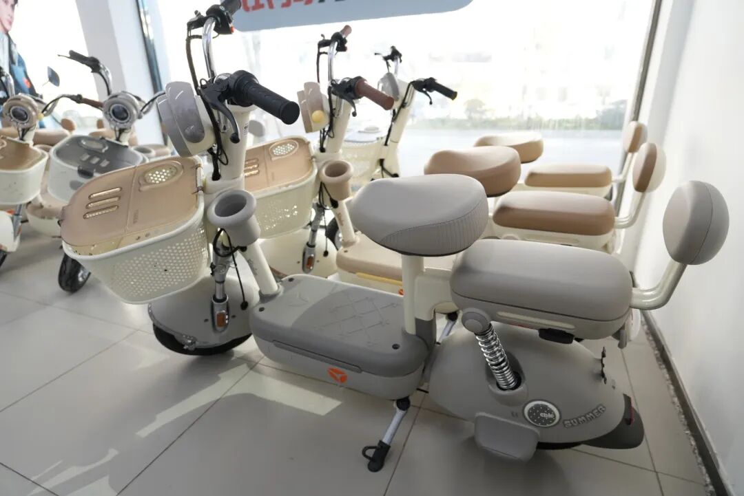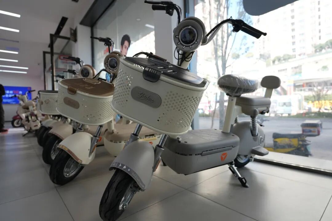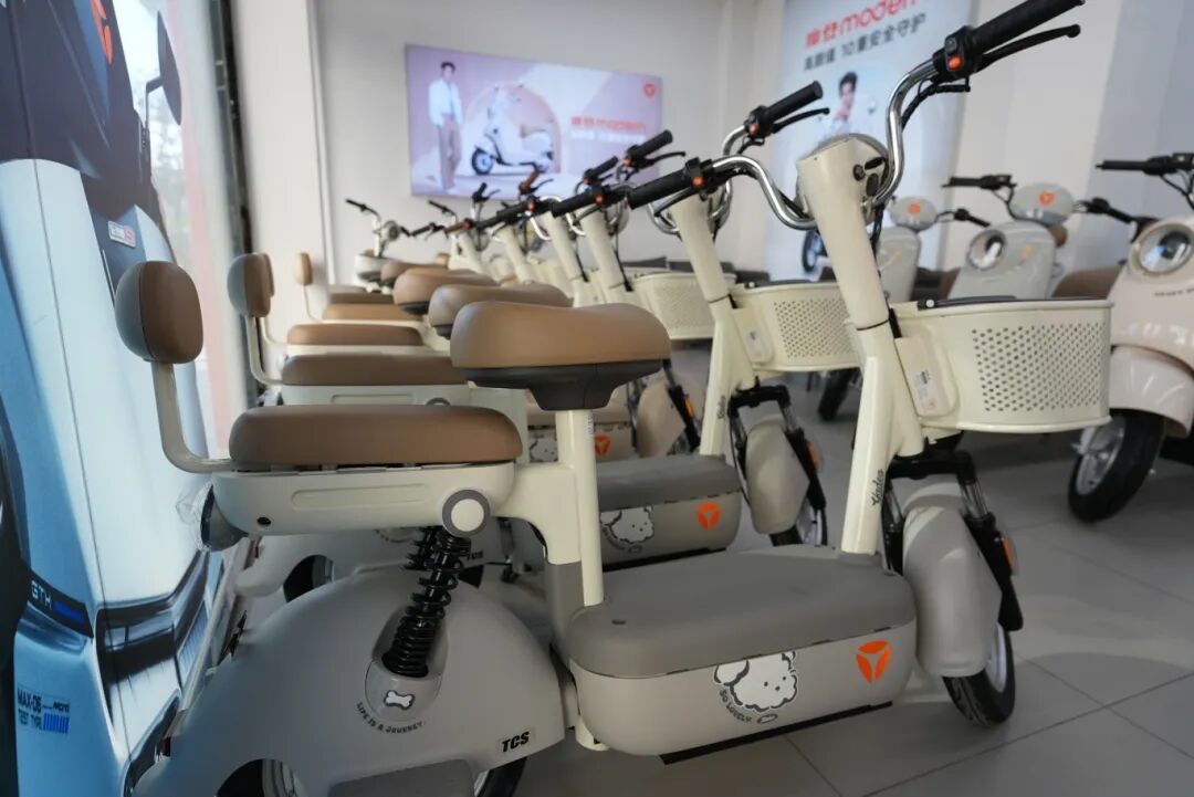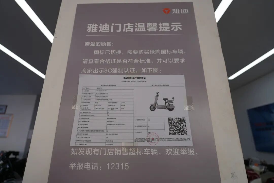 在雅迪电动自行车专卖店,店内展示了三款符合新国标的电动自行车。与旧款相比,新车外观普遍更为轻巧紧凑,车型取消了脚踏设计,并配备了后排儿童座椅。