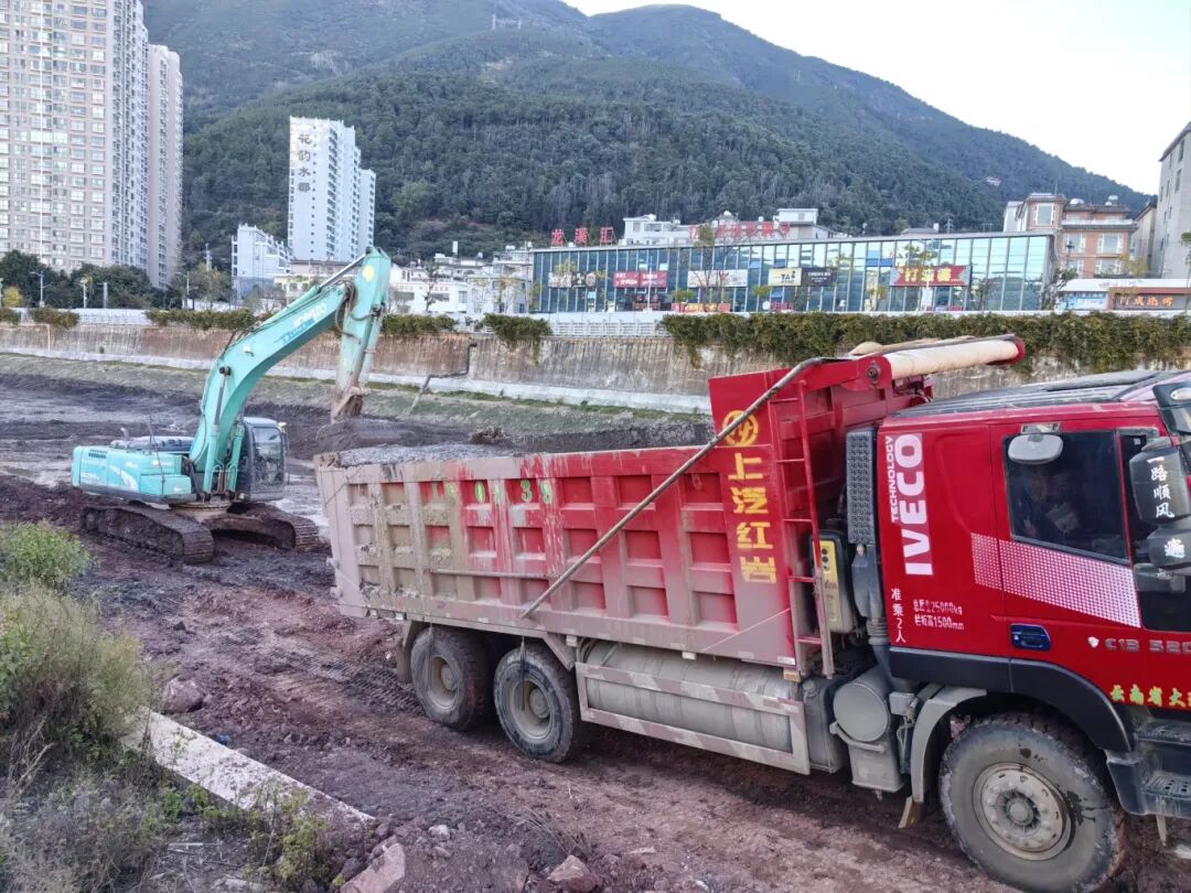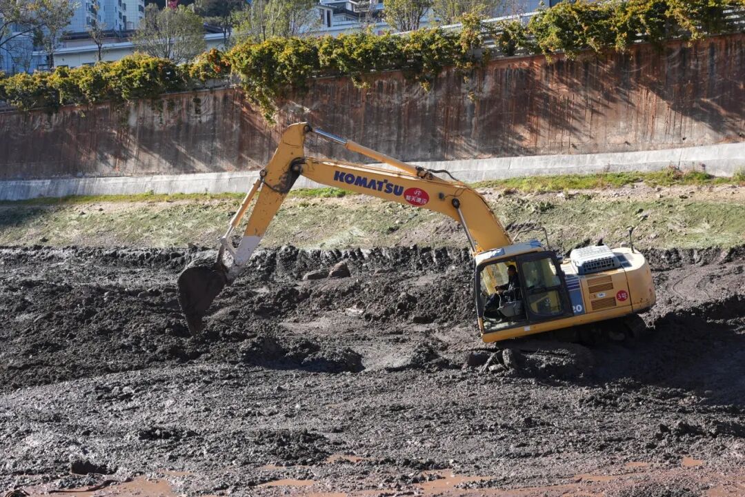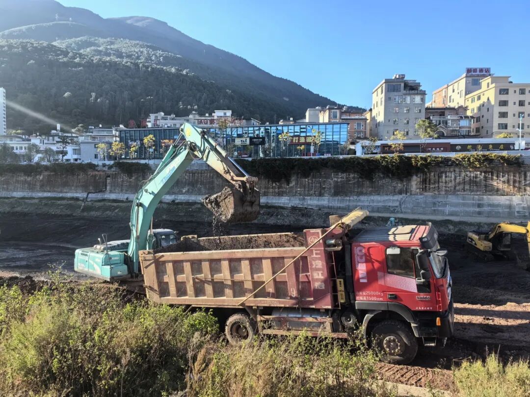 在龙溪桥南侧的施工现场,记者看到西洱河河道两侧已设置安全围挡,河床大面积裸露。数台挖掘机正将沉积的黑色淤泥挖起、装车,现场忙碌而有序。据了解,这里正紧锣密鼓进行的是大理市西洱河(黑龙桥至一级坝)水生态环境综合治理工程的核心环节——河道清淤。