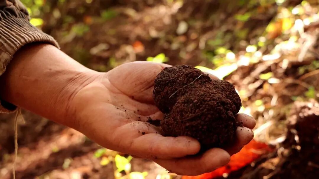 据杨军福介绍,黑松露一般生长在松树和阔叶林地里,长松露的地方一般草都比较少点,土层越深松露越大。