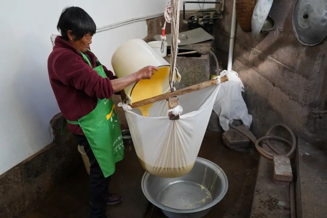 走进杨云瑞大妈的家,后院里弥漫着豌豆的清香,她正忙着制作干栏。杨大妈把豌豆粉加水调匀,装进纱袋里反复揉搓晃动,米白色的豌豆浆顺着纱布滤入盆中。静置四小时后,盆底沉淀出一层黄色的淀粉,这便是制作干栏的精华部分。