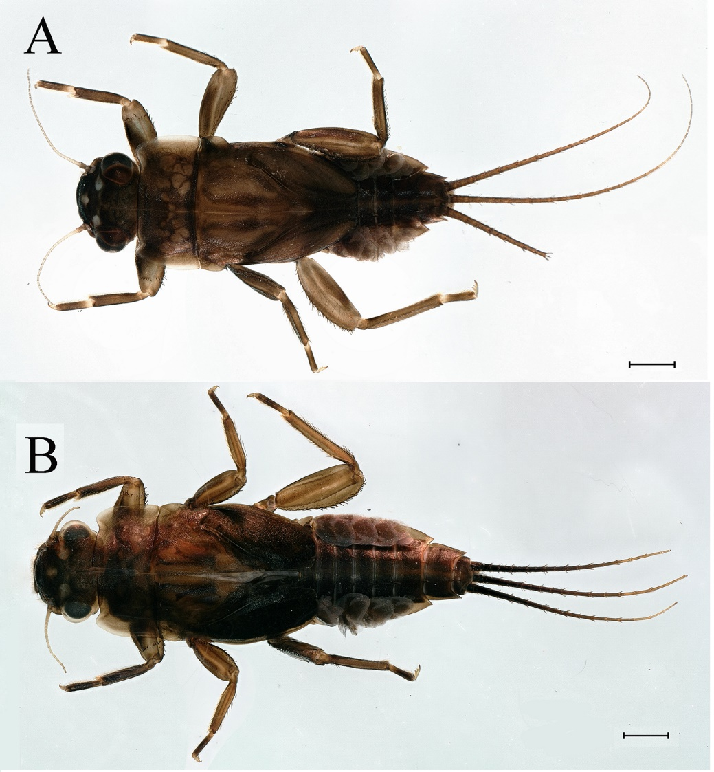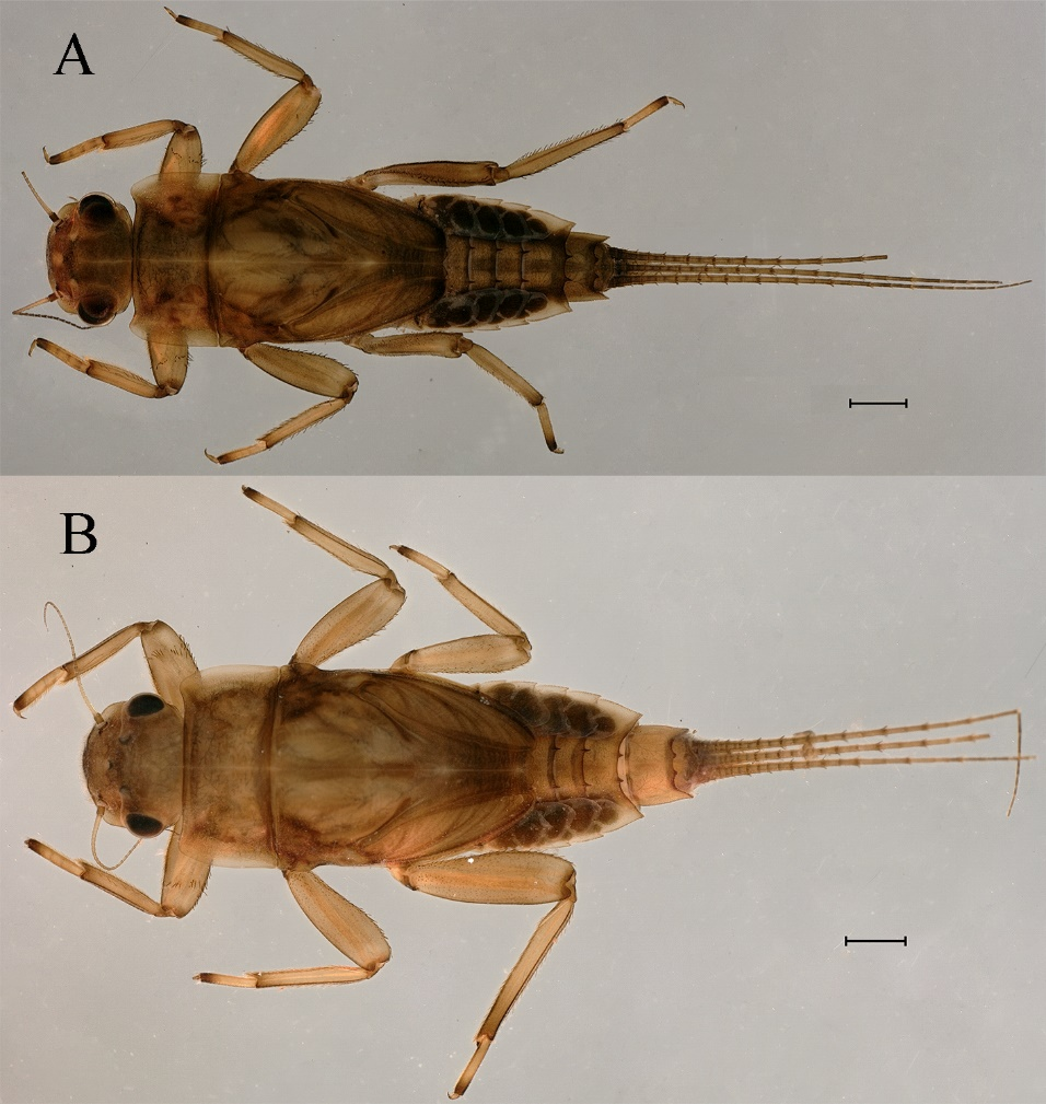 夏至带肋蜉老熟稚虫(A雄性、B雌性)