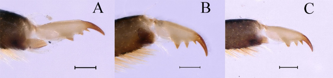 夏至带肋蜉稚虫的爪(A前足、B中足、C后足)