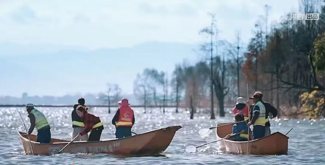 节目中,创作者智博、刘晓艳、余秀华等人走进这支队伍,亲身体验打捞工作,才真正读懂了“守护”二字背后的重量。镜头里,打捞队员们划着小船,手持打捞工具,俯身弯腰清理水面的水草、垃圾与杂物,从晨光熹微到暮色四合,身影在碧波上穿梭,宛如灵动的水鸟。
