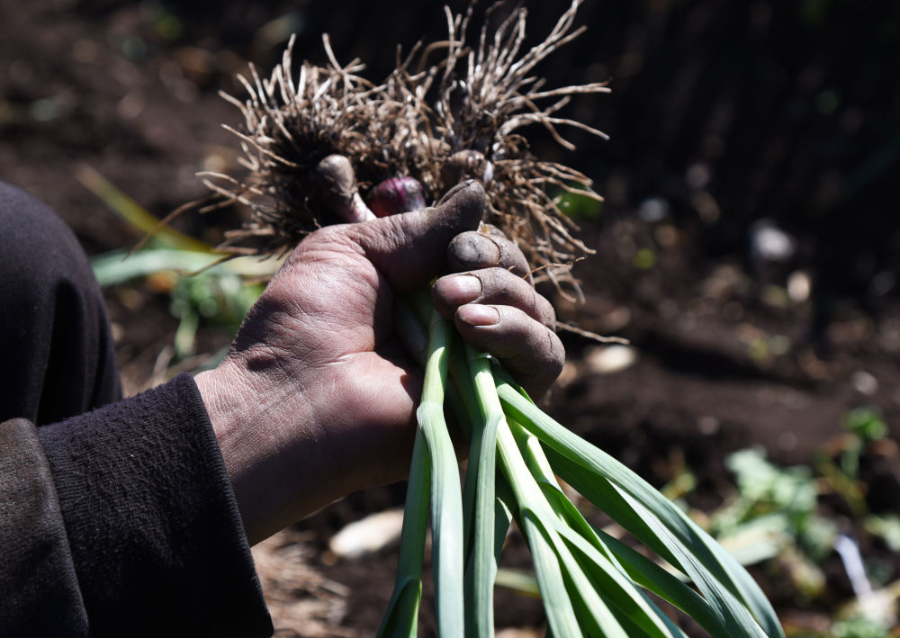 菜农在玉龙县黄山街道的菜地里采收蒜苗。(丽江融媒记者 赵庆祖 摄)