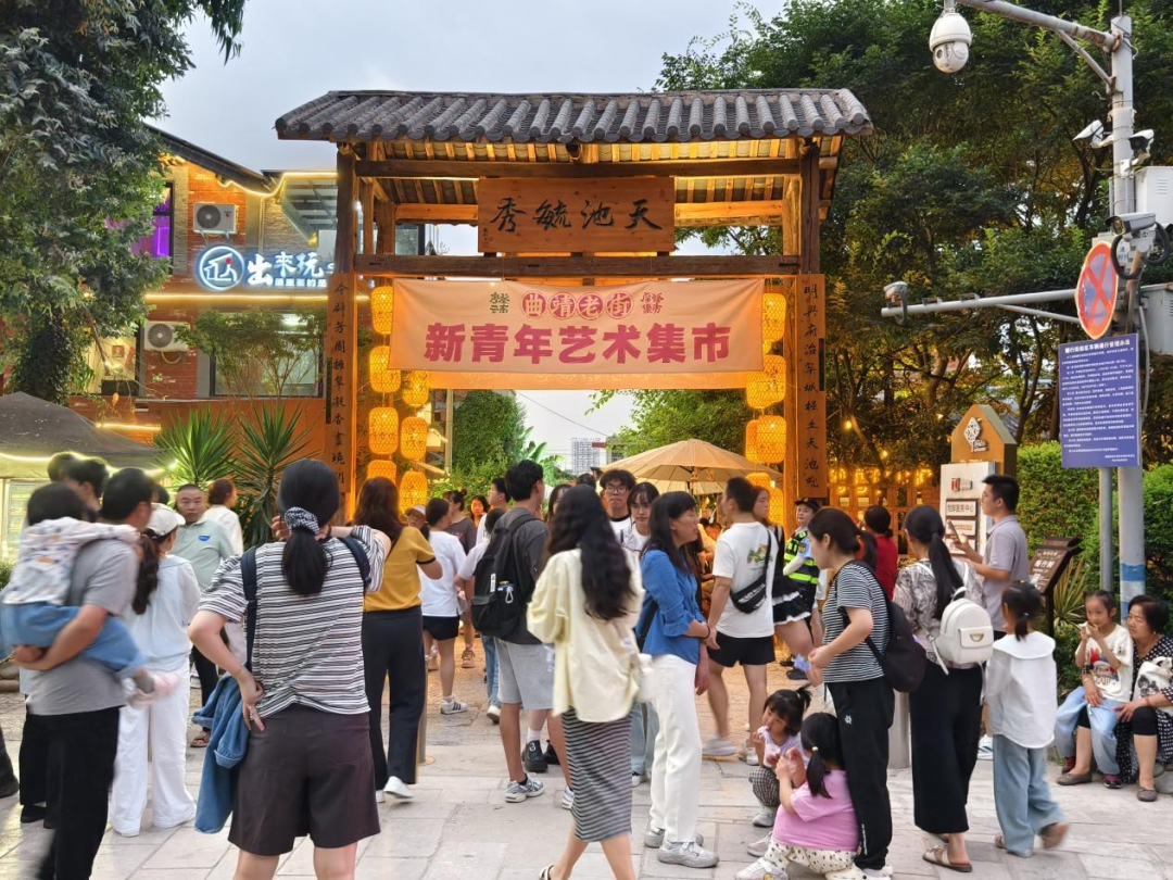 今年八月,“曲靖老街新青年艺术集市”开市,60多个创意摊位沿街排开,十天日均客流突破五万。