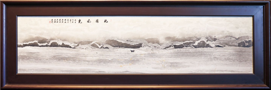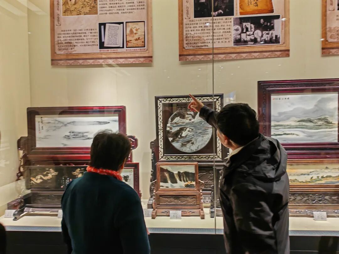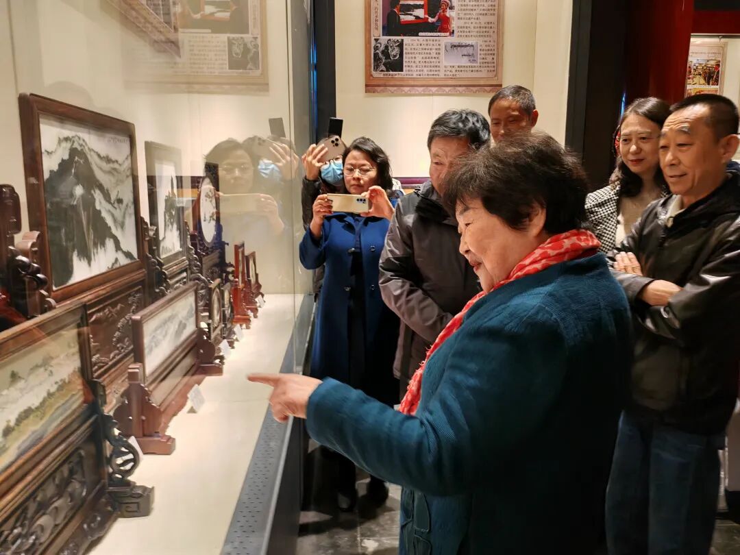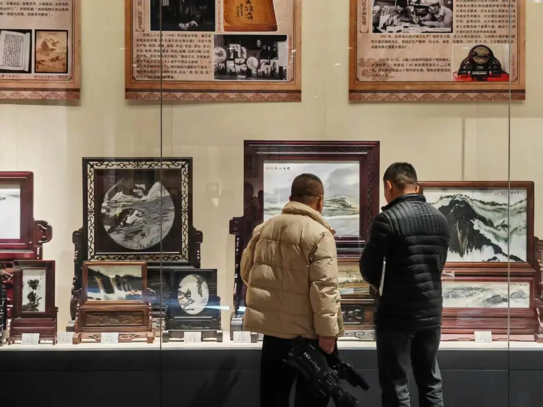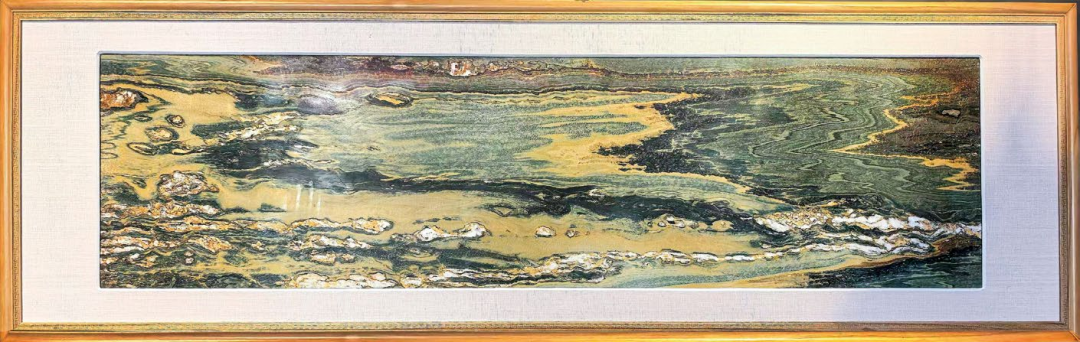 寿部长步入展厅,瞬间便被现场陈列的大理石天然画展品深深吸引。她时而驻足于一方墨色氤氲的《苍山十八溪》前,凝视那天然形成的山峦、云海、河川;时而俯身端详《千里江山》石面上流动的纹理,仿佛看见一江春水正破冰奔涌。大自然的笔触在石面上凝结成气象万千的画卷,既有工笔画的精微细腻,又不乏写意画的磅礴神韵,寿部长频频点头,连声赞叹。