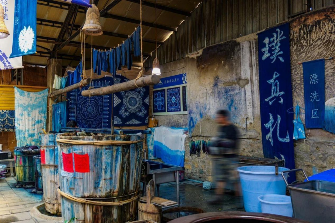 白族院落中,与蓝天白云相映的扎染布在阳光下随风飘荡;大大小小的扎染店中,憨态可掬的扎染玩偶们在陈列柜上迎来送往……在扎染体验工坊设计师的指导下,游人们可体验从扎结、染色到解结的全过程,将经典的纹样或是天马行空的抽象图形“付诸染缸”,一针一线地缝缀,一遍遍耐心地浸染……自然与人文在“苍洱蓝”中流淌,作为国家级非物质文化遗产之一的白族扎染技艺从今日走向明天。