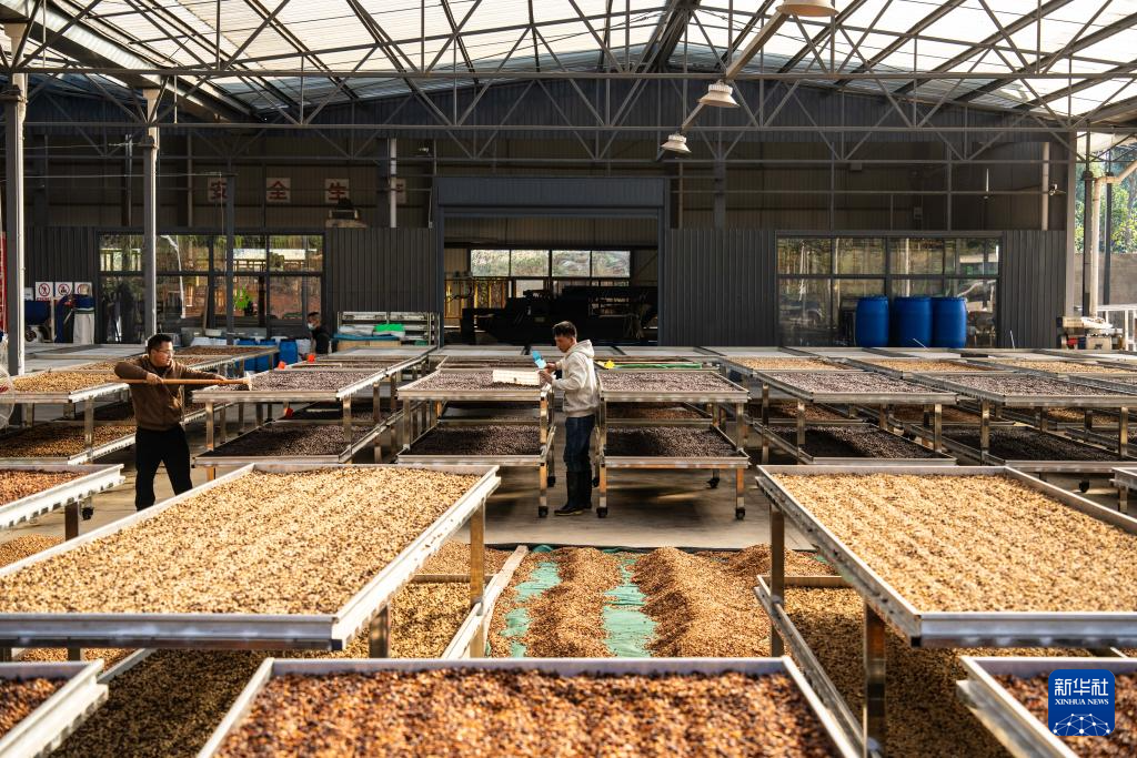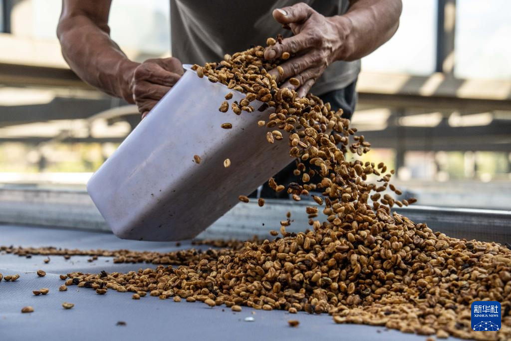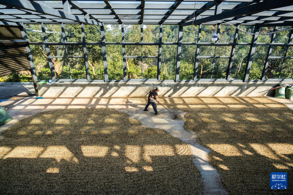 1月23日,咖农在临沧市双江县沙河乡陈家寨村云顶筑巢咖啡庄园晾晒咖啡豆。新华社记者 高咏薇 摄