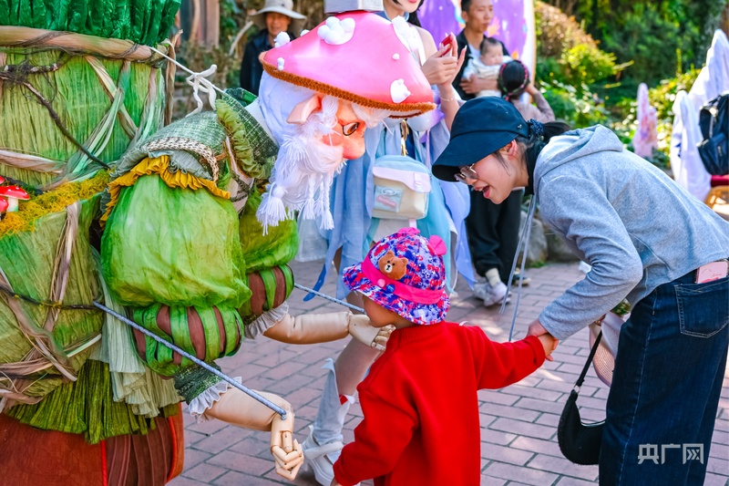 小朋友与景区内的巡游的童话人物互动(央广网记者 赵贝贝 摄)