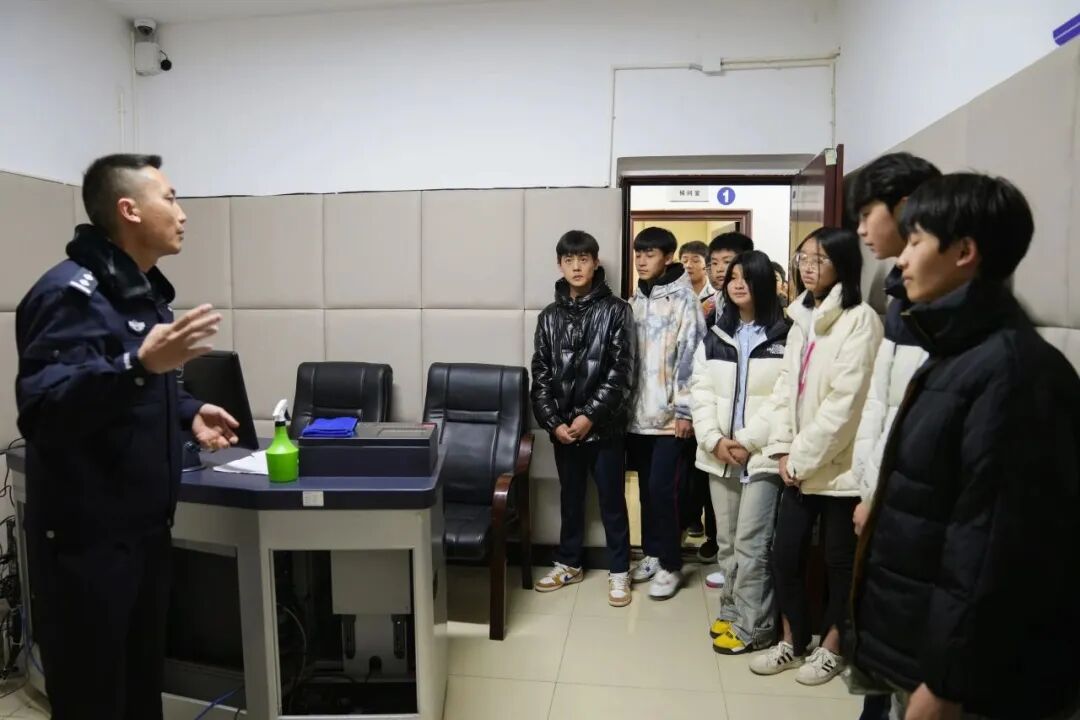 活动中,民警首先用简单通俗的语言,介绍了派出所日常执法执勤、打击违法犯罪、服务辖区群众等职能职责和工作情况,带领同学们参观了派出所装备室、调解室、户籍室、办案区等场所。