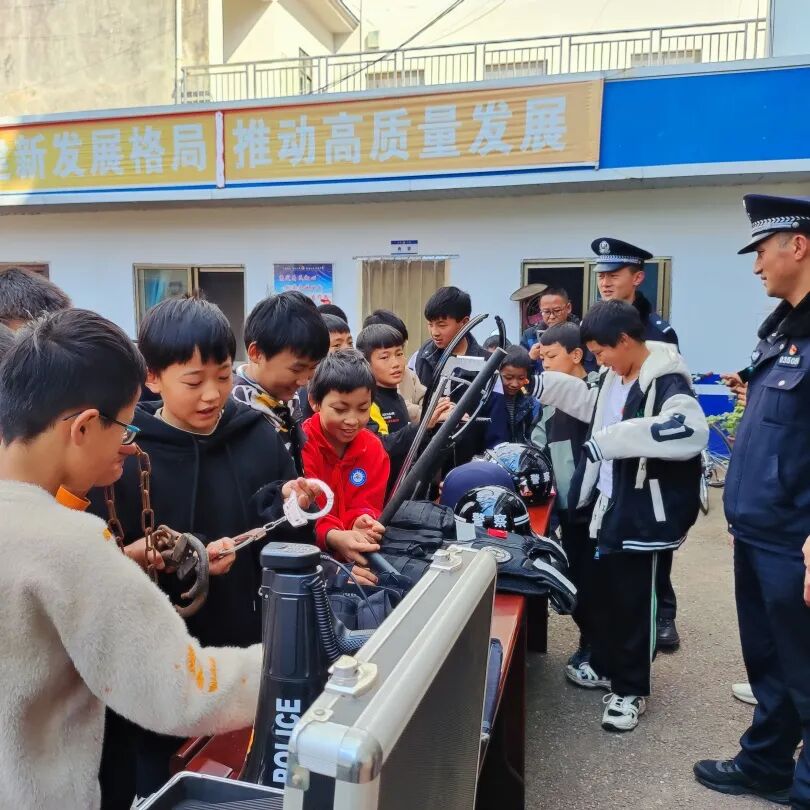 活动中,民警展示了警械,演示了警棍、催泪喷射、手铐、盾牌、钢叉等单警装备和警械的使用,用通俗易懂的语言逐一讲解其特点和用途;民警带领全体学生参观了值班室、调解室、办案区,用真实案例警示告诫同学们一定要遵纪守法,好好学习;讲授一堂别开生面的法治课,叮嘱同学们要注意防火防盗、交通安全以及电信网络诈骗等,希望同学们做一个爱党爱学习、遵纪守法的小公民。