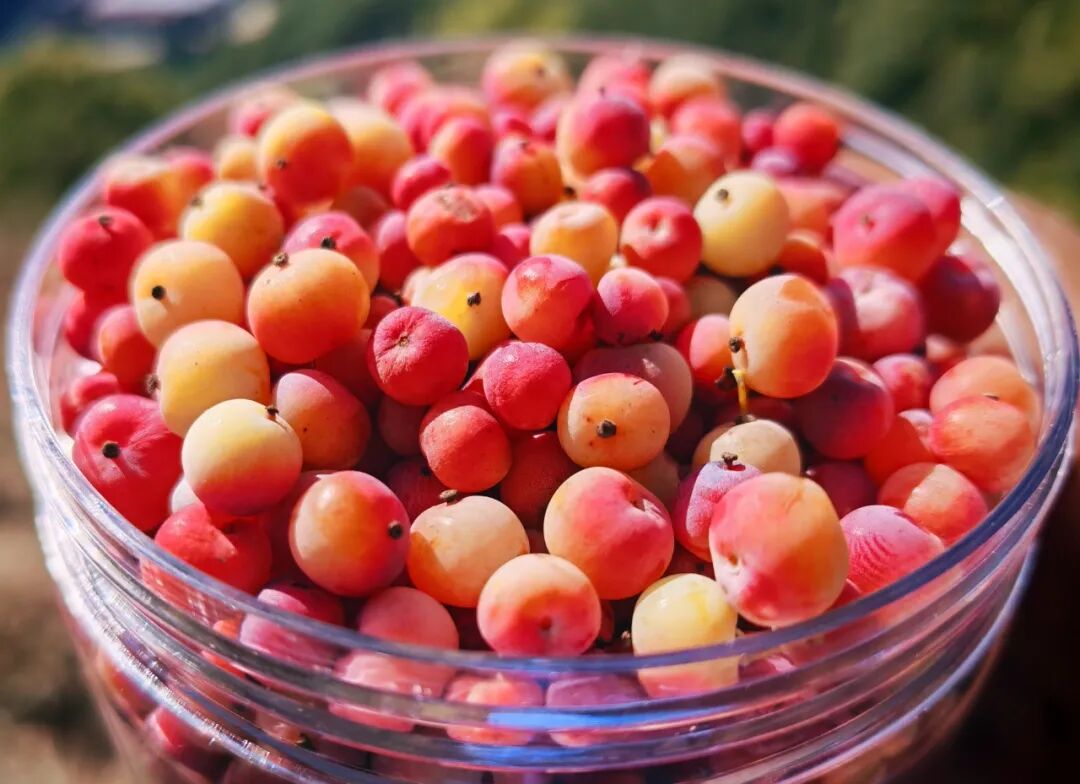 在明光寒冷的高山上,生长着一丛丛野生酸果,它们是故土的馈赠。蓝的天、白的云、绿的林,将那红的酸果映衬而出,成为一颗颗鲜艳的点缀。“咚咚咚,咚咚咚……”捣碎后的果泥,是故乡味道的独特注解。每一次在臼中将其捣碎,仿佛耳边都能听到阿婆那温柔低沉的呢喃、教导,跨过遥远的距离、穿越时空的隧道,抵达游子心房最柔软的角落。