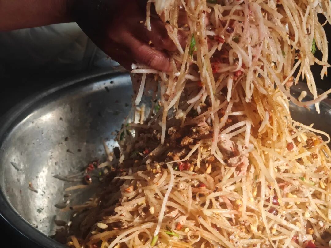 首先,将用炭火熏烤至金黄、带着微微焦香的新鲜五花肉切成小块,接着,把在火堆里炮至微焦、受热吱吱作响的干辣椒捣至粗碎小片,然后,把焙至脆香的花生轻轻敲碎至颗粒。在一切准备就绪后,将萝卜丝与准备好的食材一同放入盆中,再加入切至细碎的芫荽。在轻柔的搅拌中,食材的色彩、香气、味道相互交融,萝卜丝的爽、酸果泥的酸、五花肉的香、干辣椒的辣、花生的脆以及芫荽的清香,层次丰厚的味道在舌尖上缠绵交织,反复咀嚼间,儿时的快乐顿生心间。