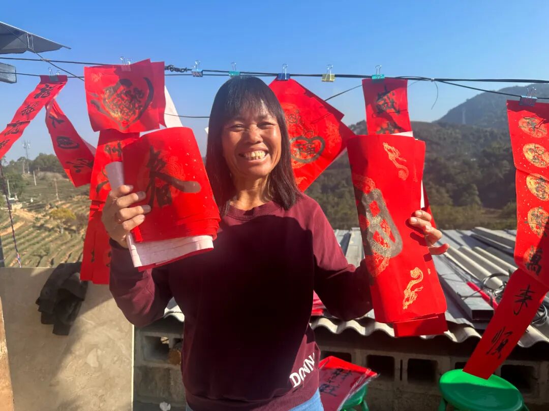 “今天我们搬新家,家具买到了,对联贴上了,年味也就来了。”广丰茶厂的茶农罗开军拿到写满祝福的对联,满脸藏不住的笑意。
