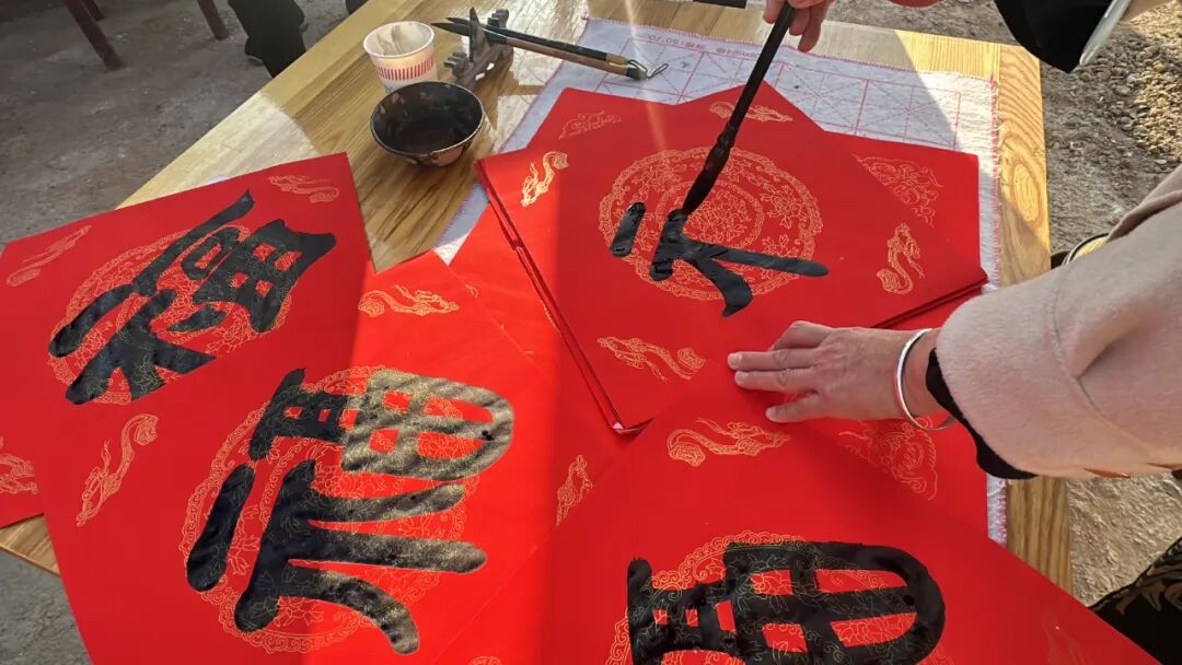 在现场,县书法家协会的老师们挥毫泼墨、运笔如飞,桌案前人头攒动,居民游客纷纷上前驻足围观,现场一派欢快祥和。不少居民前来挑选自己满意的春联或现出对联即写即取,为春节增添一份喜庆。