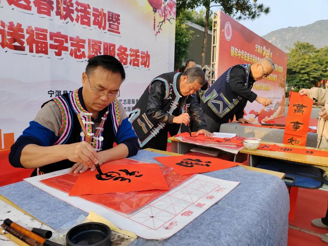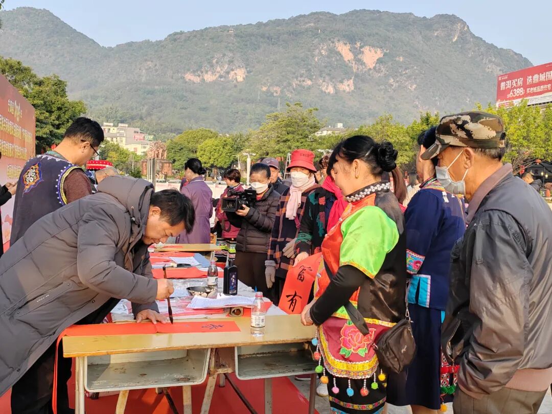 甲辰龙年春节之际,宁洱县2024年“我们的节日·春节”喜迎新春送春联活动暨“新生活·新风尚·新年画”写对联 送福字志愿活动、铸牢中华民族共同体意识主题活动暨“籽籽同心贺新春 民族团结情意浓”新春年俗文化展览年画创作体验活动在茶源广场开展。