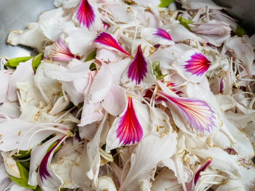 老白花是宁洱人最常吃的一种野菜,甚至很多人觉得没吃老白花的春天是不完整的,足见人们对这种花的喜爱。老白花经过煮漂与腊肉、火腿、鲜肉炒食,或与青蚕豆米、鲜肉等一起煮汤,或者加上白酒辣椒佐料制成腌菜,味道都是极为鲜美的。