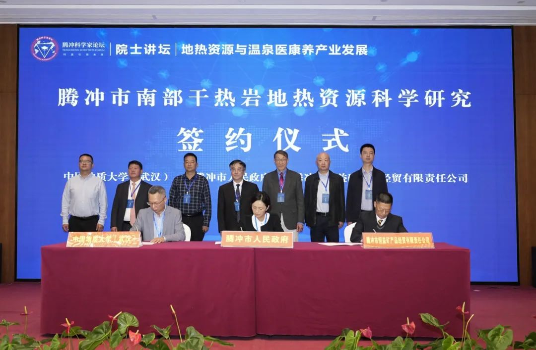 在讲坛开幕式上,中共腾冲市委书记马子兴,中国科学院院士、中国地质大学(武汉)校长王焰新,云南保山恒益实业集团有限公司董事长段治葵先后致辞,腾冲市人民政府、中国地质大学(武汉)与腾冲市恒益矿产品经贸有限责任公司三方共同签署了“腾冲市南部干热岩地热资源科学研究”三方合作框架协议。