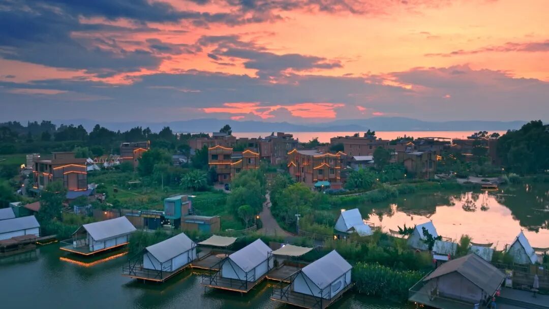如今的小渔村,通过实施人居环境提升、雨污分流等工程,村庄变得越来越美,除了优美的自然风光,翻新改造的房屋也独具古滇渔村特色,特别是以螺蛳壳为墙、杆栏为檐,在保护和修复传统民居方面融入了艺术创意。在文旅融合的加持助力下,高端帐篷酒店、文创馆、渔乐圈、露营等业态的蓬勃兴起,更是植入了一系列沉浸式体验休闲旅游项目,每月吸引数万人前来观光旅游。在此基础上,晋宁区鼓励扶持当地群众经营渔家宴、特色小吃、渔家民宿等,融入吃、住、游、购功能,小渔村快速崛起成中国最美休闲乡村的打卡地。