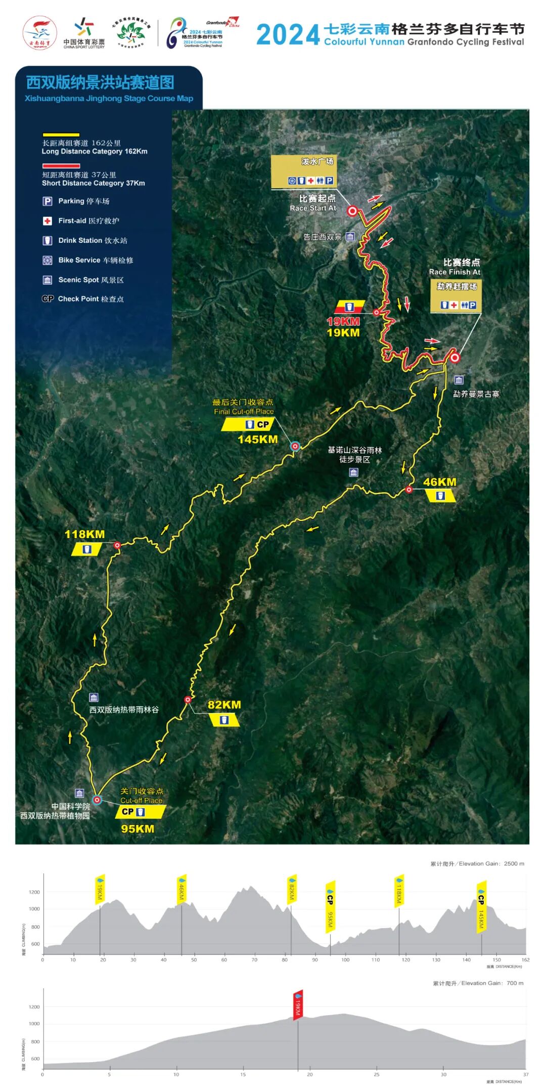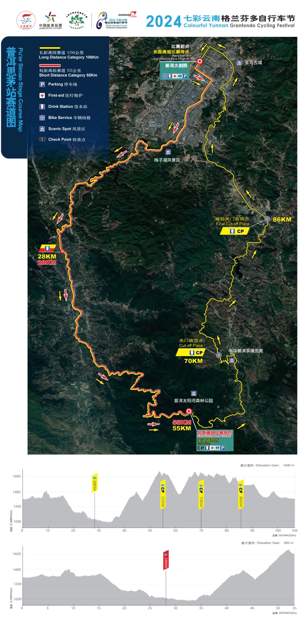 ①普洱站出发后前7公里会在思茅城区穿城骑行,随后进入梅子湖风景区窄路爬坡路段;②15-34公里之间为长距离的下坡路段,此路段经过多个村镇,请注意减速;③55公里处到达短距离终点太阳河国家森林公园,进行长短距离组别分流,短距离组冲刺,长距离组选手继续直行骑行;④67公里进入中华普洱茶博览苑景区内部,之后的20公里都是在茶山中骑行,此路段路面湿滑容易发生打滑,下坡过程中一定需要减速;⑤93公里后到达城市路段,爬过最后一座山,回到思茅城区地区;⑥100公里处进入普洱大道进入最后的平路冲刺阶段,最后回到普洱大剧院完成比赛。37公里,海拔爬升:700m(仅限山地车型+公路车型)