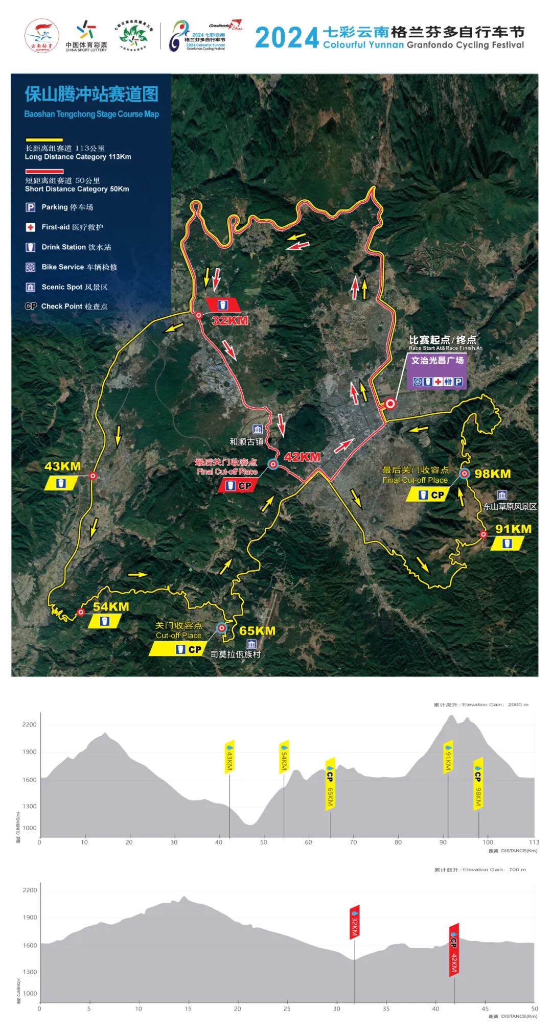 ⑧直至98公里最后关门点处到达东山山顶,之后开始下山冲刺回到市区的终点。③在32公里处长短距离组别选手分流,短距离组别路口左转;④骑行至39公里处急右转进入和顺古镇内部骑行,和顺古镇内部为石板路,且路面较窄,注意减速;
