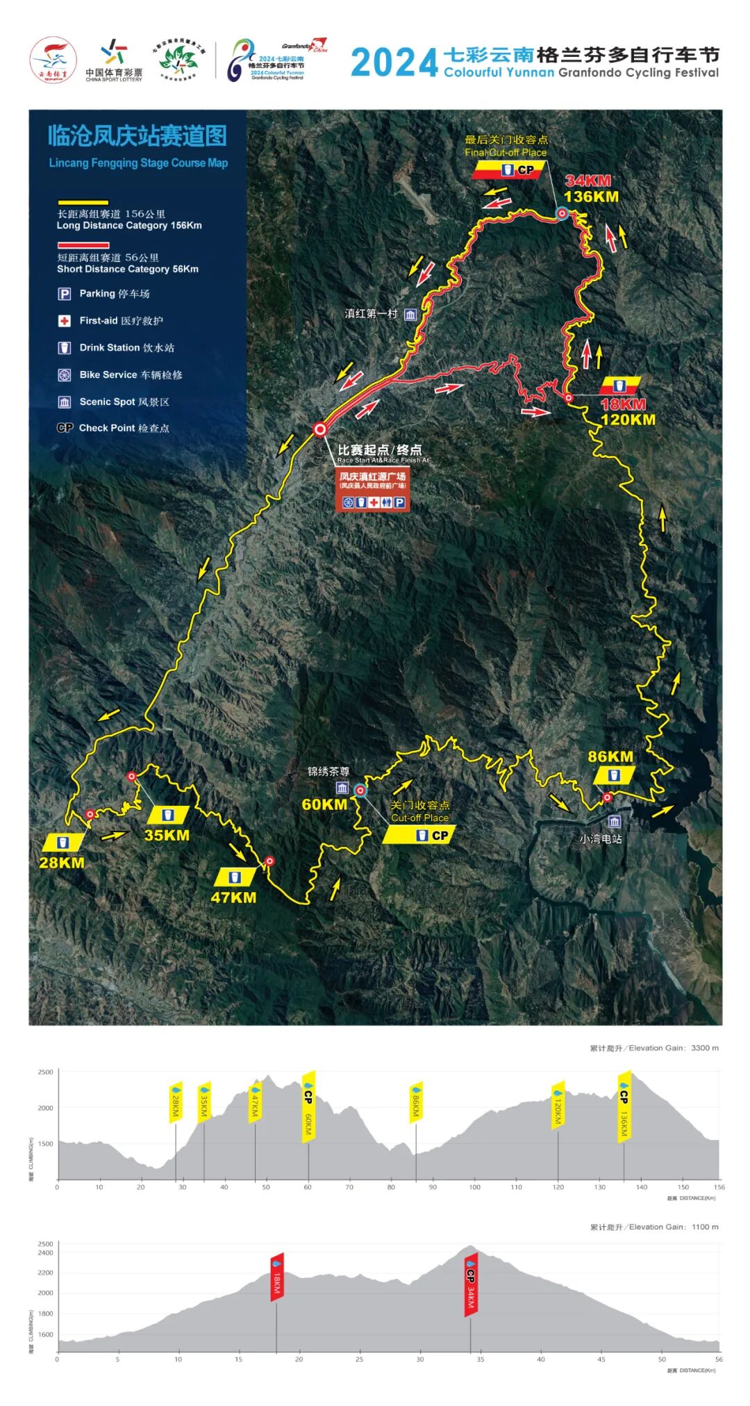 ①凤庆站起点出发后至23公里在国道公路上持续下坡骑行;②23公里处左掉头过桥后进入山林路段,到达此处前需要提前减速;③24-46公里进行幸龙山爬升骑行,该路段为本次比赛最高海拔爬升路段,赛道两侧山体落差较大,一定注意减速骑行;④46-60公里为平路森林路段骑行,该路段树林较多,视野较差,请注意路面情况;⑤64-82公里开始连续下坡,其中70公里左右有连续急弯并途经多处减速带,请注意志愿者和路标指引,及时减速;⑥83公里小湾水电站处连续骑经两条隧道,之后开始爬坡至113公里左右;⑦经过最后两个饮水站到达136公里的山顶,最后路程持续下坡回到城区,冲刺至终点。(二)凤庆站短距离组赛道描述