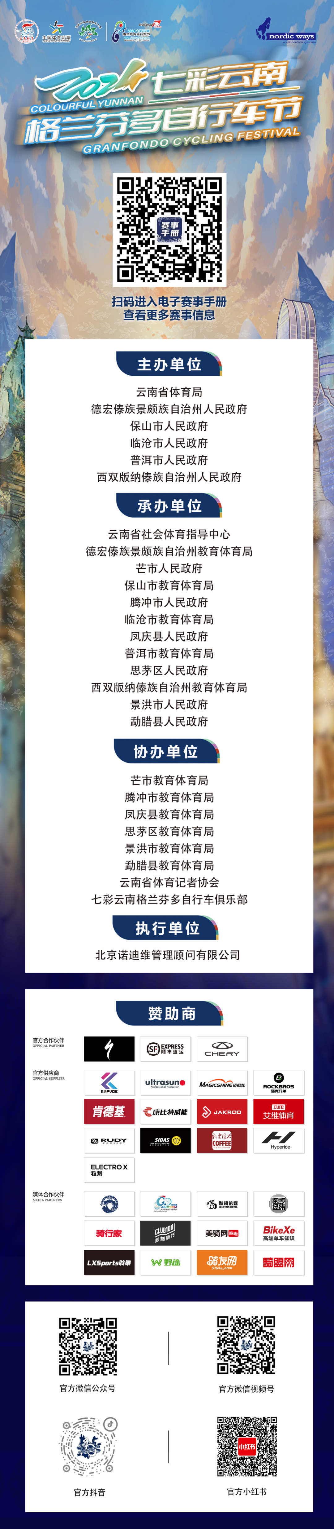 ①凤庆站短距离组与长距离组出发方向相反,出发后延城市主路一路向北部山区骑行;③18-34公里间为平路骑行,34 公里到达山顶关门点后一路下坡回到城区冲刺至终点。55公里,海拔爬升:900m(仅限山地车型+公路车型)