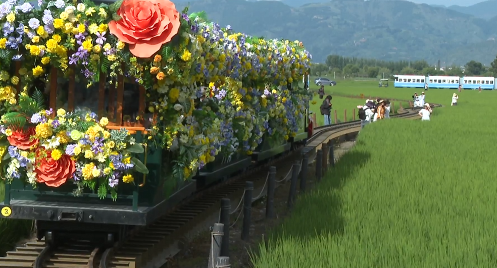 大理稻田很绿、天空很蓝、温度也很舒适,我们大家都玩得特别开心。而且小火车上面还有很多花朵点缀着,绕着稻田行驶一圈很有氛围,很浪漫。