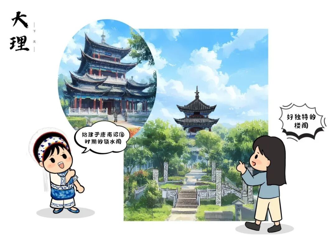 锁水阁始建于唐开元二十七年(公元739年)南诏时期,为南诏国雄关龙尾古关的重要历史遗迹之一。其原址位于龙尾古城南城墙东端、西洱河入水口的要冲之地。作为洱海六大名阁之一,锁水阁融合了大理洱海的风水文化、民族宗教信仰与人文景观,具有显著的文化与建筑价值。历史上,锁水阁历经明、清两代重建,至民国时期仍存有一所殿宇及三间侧房。新中国成立后屡遭损毁不复存在。直至2017年底,大理市于大关邑南村原址东侧约500米处的新址重建锁水阁,再现其历史风貌。