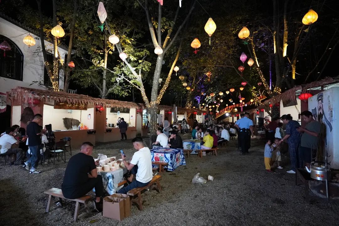 侠客小吃街汇聚了各类云南特色美食,从传统的过桥米线到当地的特色烧烤,丰富多样的小吃摊位吸引了众多游客,展现出乡村夜间美食文化的活力。