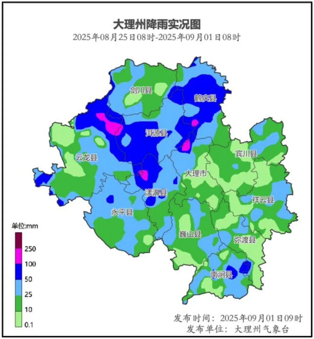 上周8月29日全州出现中到大雨局部暴雨,其余时段为阵雨局部中雨。上周国家气象观测站累计雨量:南涧、漾濞、洱源、云龙、鹤庆、永平27.6~46.3毫米;其余站4.8~24.3毫米,全州平均26.1毫米。乡镇自动气象站累计雨量最大为云龙县长新乡新塘站122.0毫米;累计雨量在100毫米以上降雨主要分布在云龙、大理、漾濞、鹤庆的部分乡镇。上周共出现短时强降水最大为云龙县白石镇55.8毫米(8月29日00~01时)。