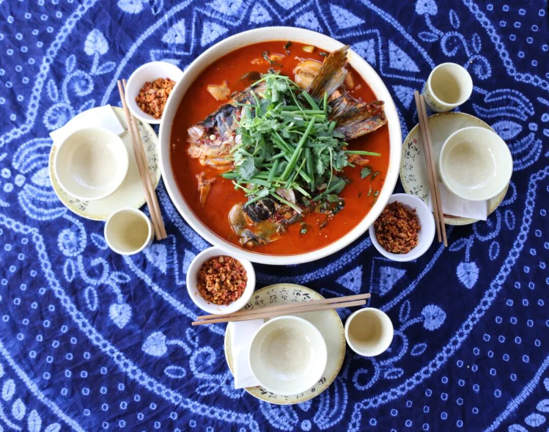 来州城一定要尝海稍鱼 —— 新鲜的鱼用酸辣汤底煮得鲜嫩,配上本地辣椒等佐料,一口下去酸辣开胃,是宾川人待客的招牌菜,与此相配的,还有酸辣咸香的州城韭菜腌菜,采用常见的食材,独特的配方,传承家乡的味道。若想换种口味,不妨试试“二对咖啡”的侨乡特调,咖啡豆混着本地蜂蜜、乳扇碎,咖啡香里藏着白族风味,坐在老茶馆里慢慢品,时光都变得柔软。