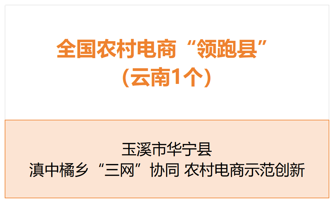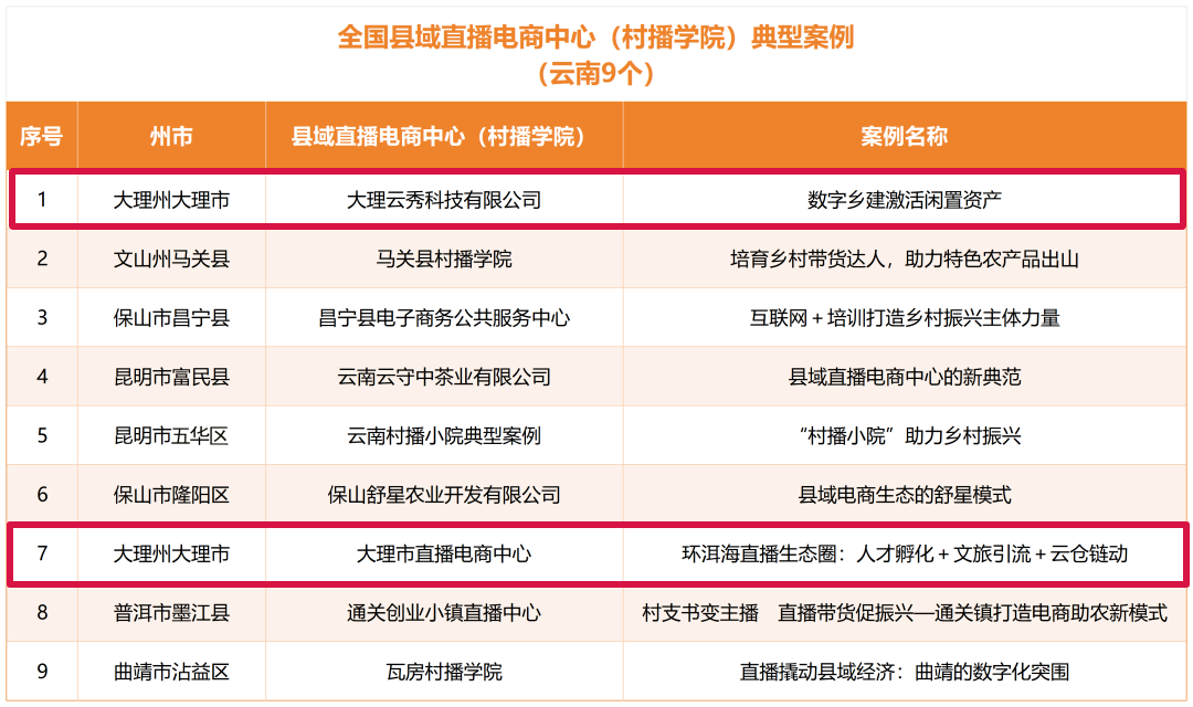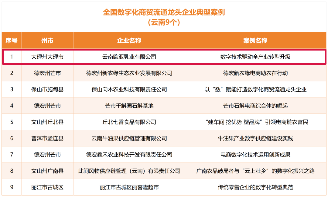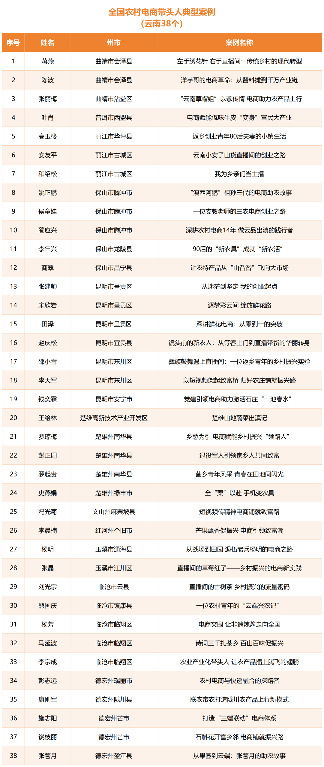其中,玉溪市华宁县入选全国农村电商“领跑县”,大理云秀科技有限公司“数字乡建激活闲置资产”等9个案例入选全国县域直播电商中心(村播学院)典型案例,云南欧亚乳业有限公司“数字技术驱动全产业转型升级”等9个案例入选全国数字化商贸流通龙头企业典型案例,蒋燕“左手绣花针,右手直播间:传统乡村的现代转型”等38个案例入选全国农村电商带头人典型案例。