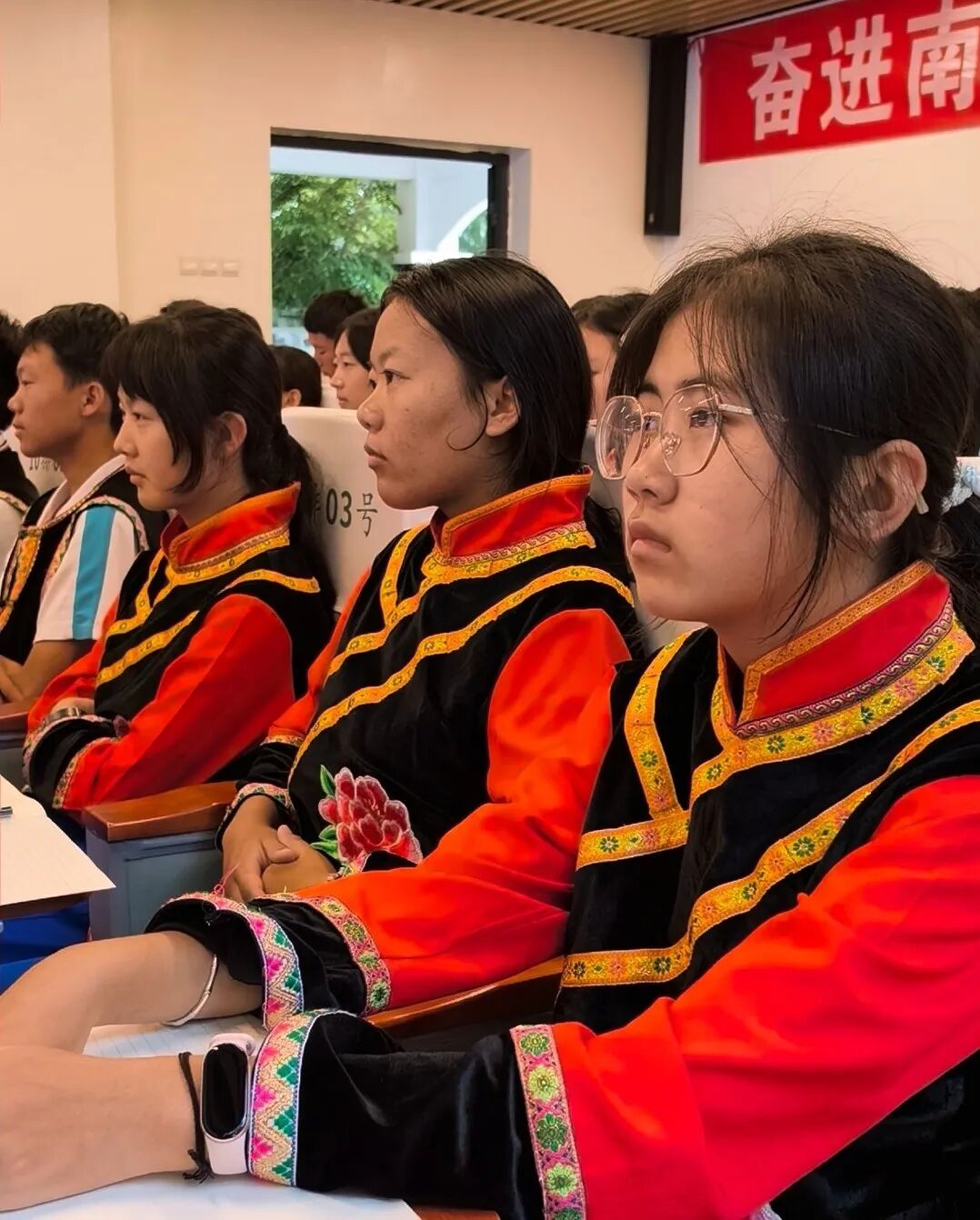 高一的杨灵杉同学说道:“讲解员的演讲让我感受到中华民族血浓于水的亲情与强大凝聚力,新时代青少年应维护民族团结,为复兴梦贡献力量。”另一旁的李福海同学也感慨:“听完故事,我深知铸牢中华民族共同体意识与维护民族团结的重要性,我会将其根植心中,自觉践行。”