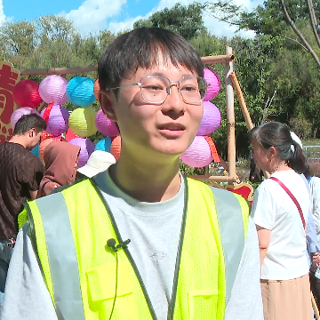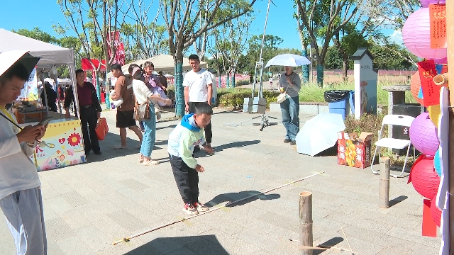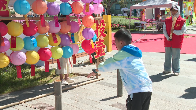 洱海生态廊道的方寸市集变身传统民俗体验场。猜灯谜区悬挂着各色灯笼,谜语纸条随风摇曳;投壶场地传来阵阵欢呼,游客们争相体验这一古老游戏的乐趣。来自湖北的段李果小朋友在洱海边度过了一个欢乐的中秋节。