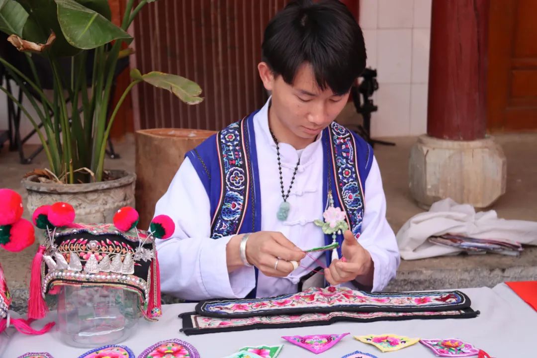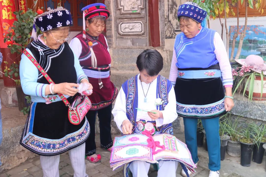 2025年伦敦工艺周期间,来自大理州鹤庆县的白族服饰(鹤庆甸南刺绣)省级非遗传承人杨文焕的作品“甸南新娘装”在“万物有灵:白族匠心与自然之艺”主题展览中引发关注。作为白族服饰(鹤庆甸南刺绣)省级代表性传承人,杨文焕自幼随母亲学习刺绣,怀着对民族文化的无限钟爱,抢救还原了太子帽、牌坊巾、紫金冠、八卦帽、童子采莲帽等精品工艺。生于1959年的她,创新实践不仅限于设计,更体现在传承模式上。她在鹤庆县金墩乡成立甸南刺绣协会,通过“协会+合作社+传习所”模式,带动200余人参与非遗传承,让更多年轻人近距离体验刺绣技艺,很多作品已走出云南,走向全国。巍山是国家文化部命名为“中国民间扎染艺术之乡”,今年35岁的李敏,出生于巍山县南诏镇自由村委会石龙山村。1988年,李敏的父亲李石生创办了三彝扎染厂的前身———巍山县巍宝彝族染织厂。银针扎就天下绝版,巧手解开人间疙瘩。这是李敏父亲李石生生前给三彝扎染厂写下的一幅对联。父亲去世后,三彝扎染厂的发展重担全部落到了李敏肩上。她面对困难不退缩,带领村里妇女学手艺、谋出路,她总是用父亲生前的话鼓励自己:“办好扎染厂不单单是赚钱的问题,而是一种社会责任,让公司里所有的老员工有饭吃。”2025年2月,35岁的李敏被评为巍山县非物质文化遗产扎染技艺县级代表性传承人。多年以来,她把车间设在村寨,在农户家中设立扎花点,将生产原材料直接送到村子里,积极鼓励农村妇女利用农闲时间增加收入,为500多名农村妇女解决就近就业问题,每年发放劳务支出300多万元。苍山脚下洱海之畔的萂村,是一个有着四千年历史的白族古村落,至今保留着原生态的白族歌、舞、乐和服饰文化。2023年2月,“00后”白族小伙张鸿林被命名为宾川县县级刺绣非遗传承人,曾经的“叛逆少年”成了村里绣娘们的“老师”。工作之余,张鸿林坚持在抖音、小红书等平台发布刺绣制作视频,拓展电商销售渠道,并通过网络直播的方式进行免费教学。“希望我们的传统文化更好地、完完整整地传承下去。”张鸿林坚定地说。他悉心传授刺绣技艺,并帮助她们对接订单,拓宽销路,带动绣娘们增加收入。2024年从云南师范大学毕业的杜宇峰