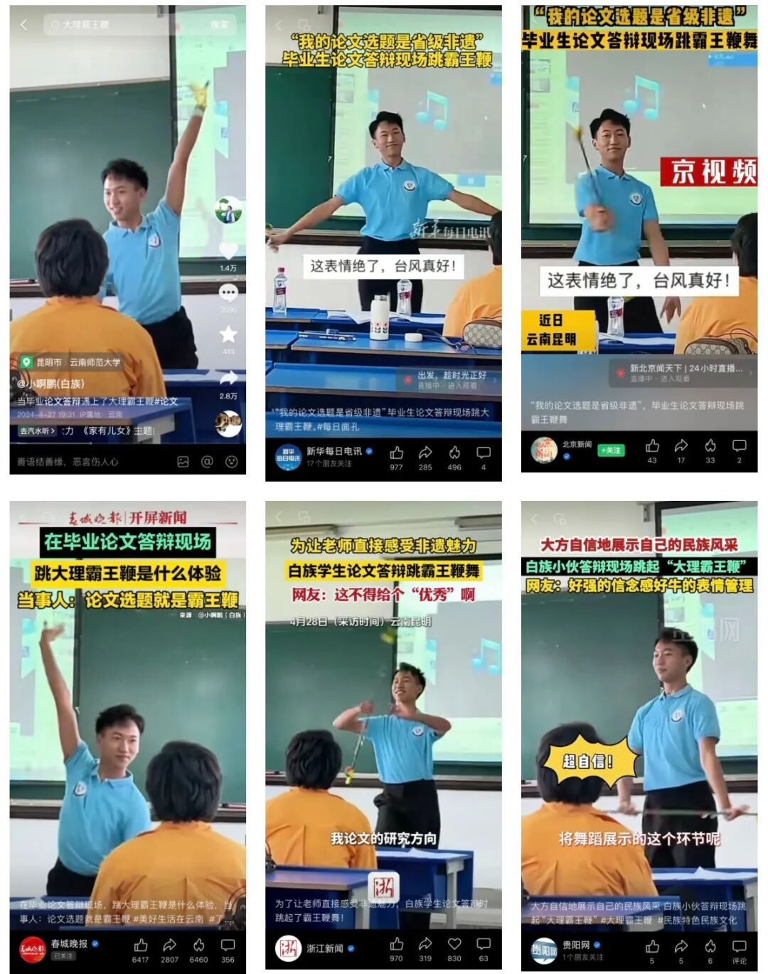 他眼中,家乡不只有白族霸王鞭,还有力格高、斗蹄壳等舞蹈形式,这些都是白族先民们传承留下的大理民族至宝,作为地道的白族年轻人,更应该付出实际行动去传承发扬。于是,他的大学论文选题选择了大理霸王鞭舞蹈研究,并在答辩中设计了现场舞蹈展示环节,让老师更直观地感受白族文化的精神风貌。