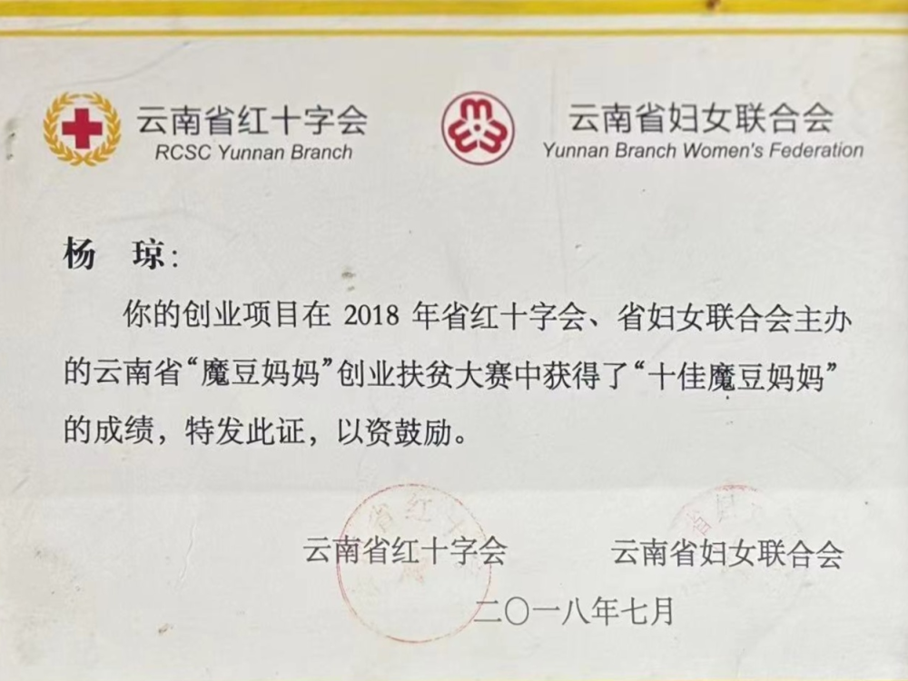 “从接触乳扇至今,从鲜奶的收购到成品的产出,我一直坚持无添加、原生态的传统工艺,因为只有良好的品质才能赢得消费者的认可!”谈到从业经历,杨琼自豪地说道。为满足市场需求,乐众乳扇坊先后两次扩大了生产规模,聘请了多名熟练制作乳扇传统技艺的妇女专门生产加工乳扇。为提高自己产品的市场竞争力,她在上关镇承租场地,新建了无尘厂房。在经过这几年生产技艺和客户的积淀,加之诚信经营,如今每年的销售额已突破200万元。凭借着敢闯、敢拼、敢于尝试的劲头,杨琼获得了多项荣誉,2018年,在云南省“魔豆妈妈”创业扶贫大赛中获得“十佳魔豆妈妈”称号;2021年,受聘“白州技能人才助力乡村振兴百村行”大理市专家服务团成员。