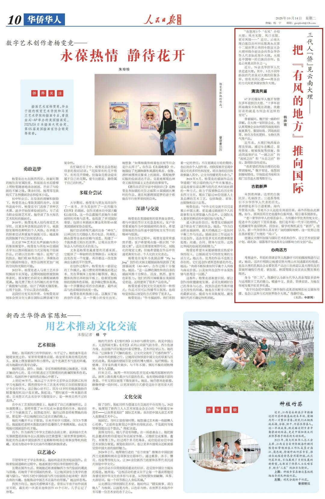 “老一辈华侨华人的艰苦奋斗,为传播中华优秀传统文化、促进中外交流打下坚实基础,他们是年轻一代学习的榜样。”毛埴鋮常年旅居欧洲,因创业、留学的契机成为“新侨”。他认为,新一代华侨华人具有更广阔的国际视野,这一优势让他在喜洲看到了大理的“风口”。